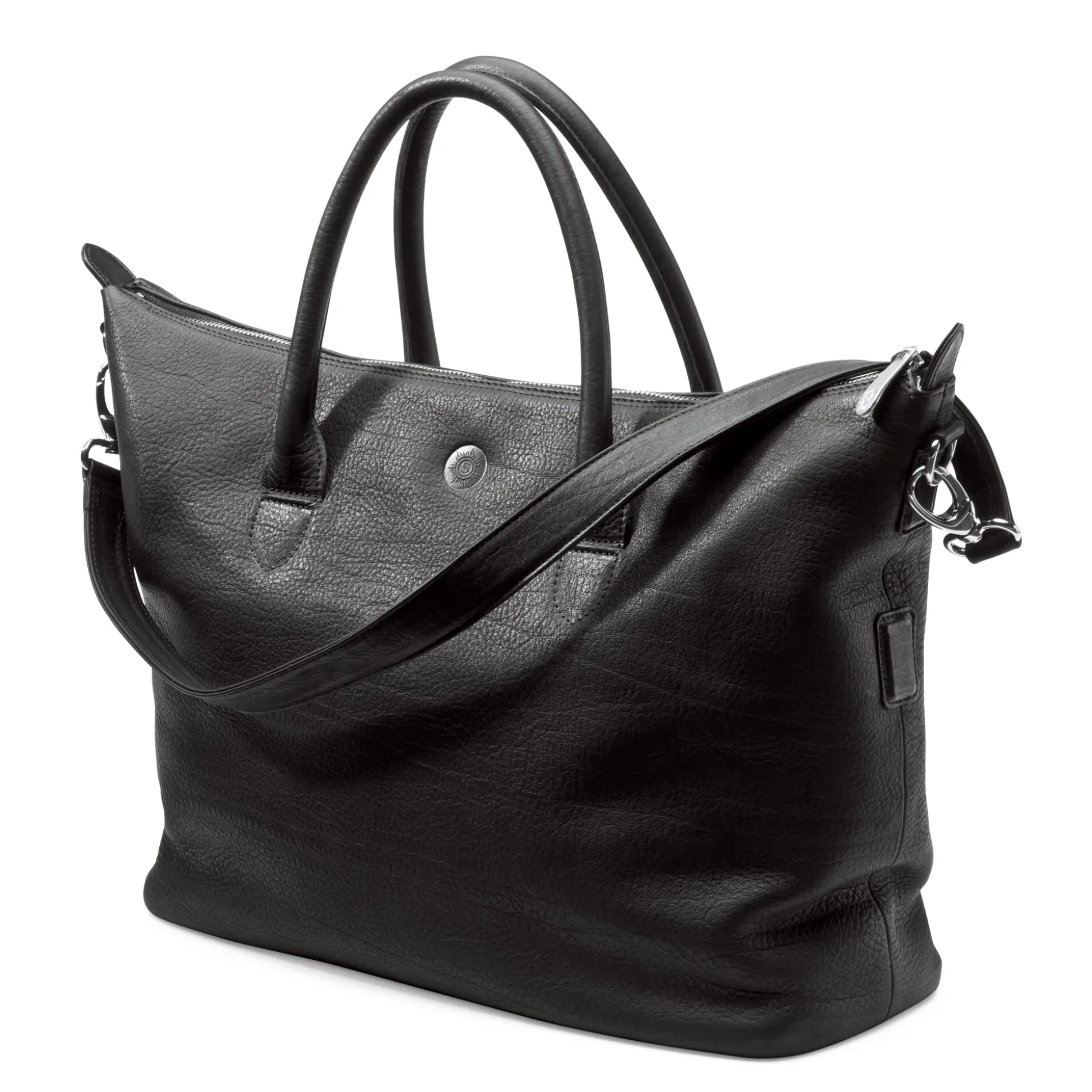 Eben noch geräumige Universaltasche, wird diese Tasche durch zwei einfache Handgriffe – die Seiten lassen sich herunterklappen – zur kompakt-eleganten Handtasche. Über die Schulter getragen, zeigt die Tasche ihre dritte Form: Ein bequemer Ledertrageriemen sorgt dann dafür, dass die Hände frei bleiben. Ob als Handtasche, kleine Reisetasche, für den Einkauf oder das Büro (auch ein Ordner passt hinein) – diese Tasche wird allem gerecht.