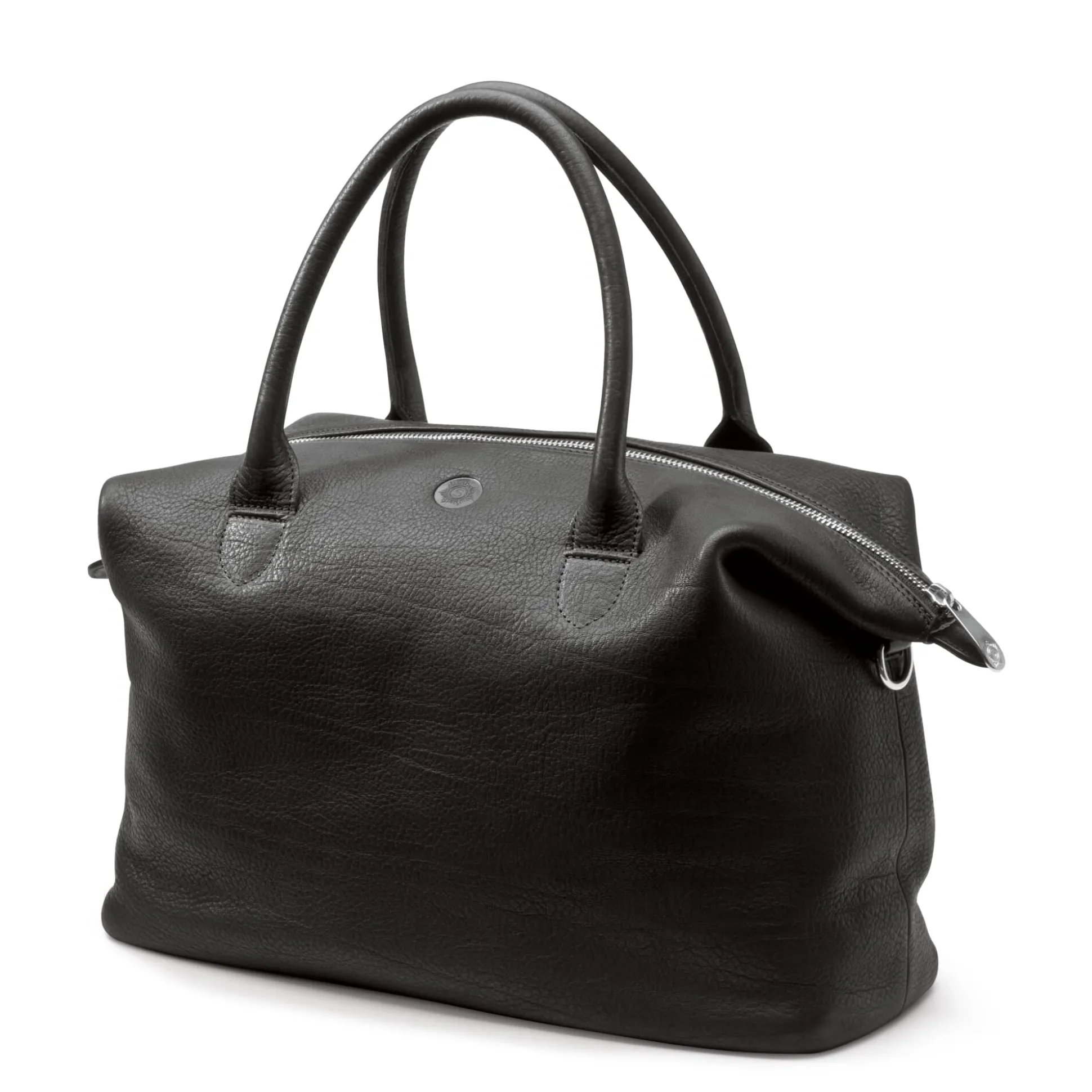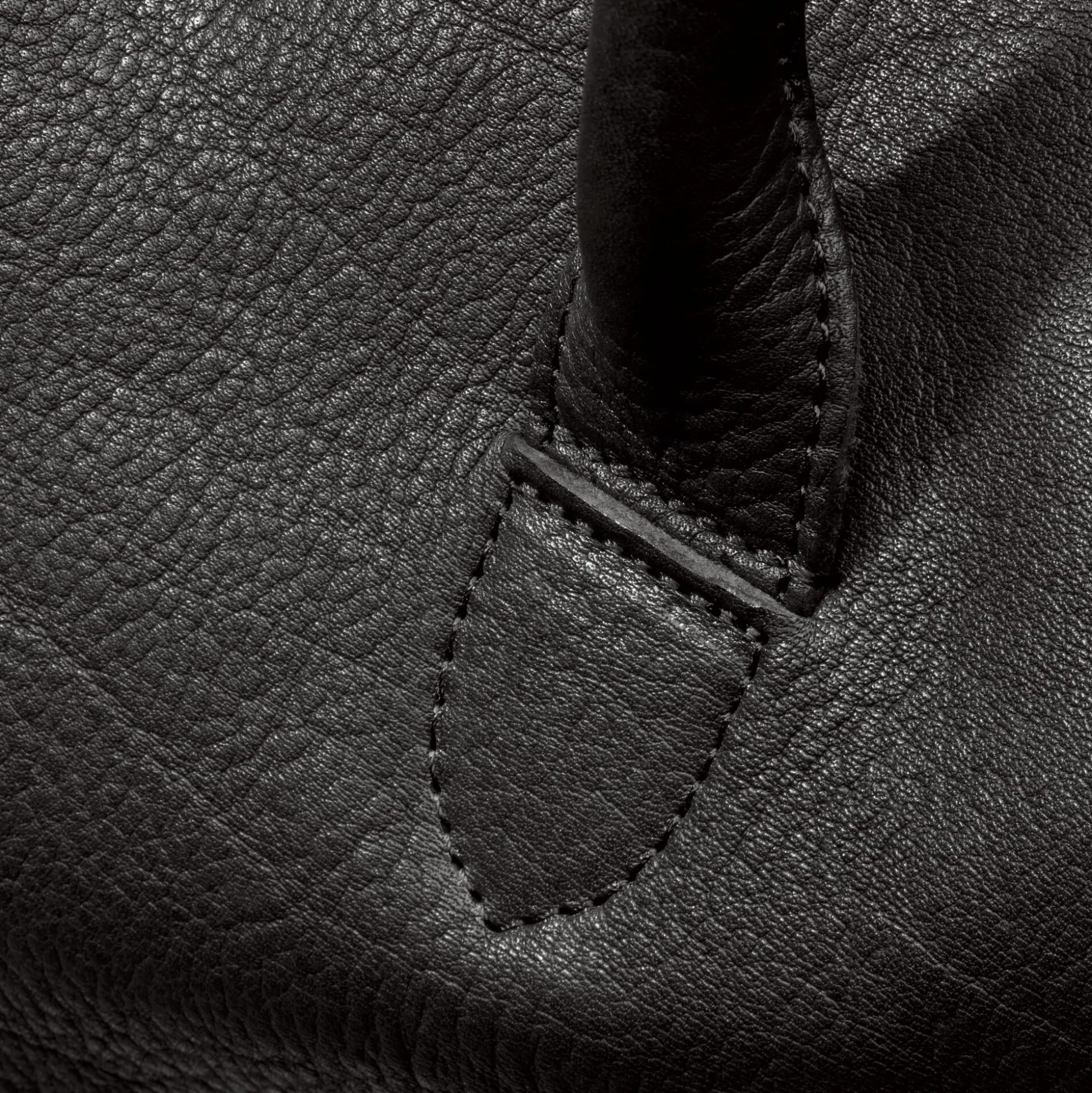 Das Konzept der funktionalen Vielseitigkeit ist bis ins kleinste Detail durchdacht. Zwei verdeckt ins Leder eingearbeitete Magnete sichern die Form, wenn die Seiten heruntergeklappt sind und so gleichzeitig die Befestigungsringe für den abnehmbaren Trageriemen verdecken. Die Lederabdeckungen der „unsichtbaren“ Magnete werden sorgfältig von Hand in gerundeter Form eingeschlagen und aufgenäht. Die beiden kräftigen Ledergriffe sind durch eine eingearbeitete Kordel verstärkt, das verbessert den Tragekomfort entscheidend. Über einen im Hauptfach angebrachten Lederriemen mit Karabiner ist der Schlüsselbund gut zu sichern und schnell greifbar. An ihren Außenkanten ist die Tasche fast ohne eine sichtbare Naht gearbeitet – bis hin zum Boden.