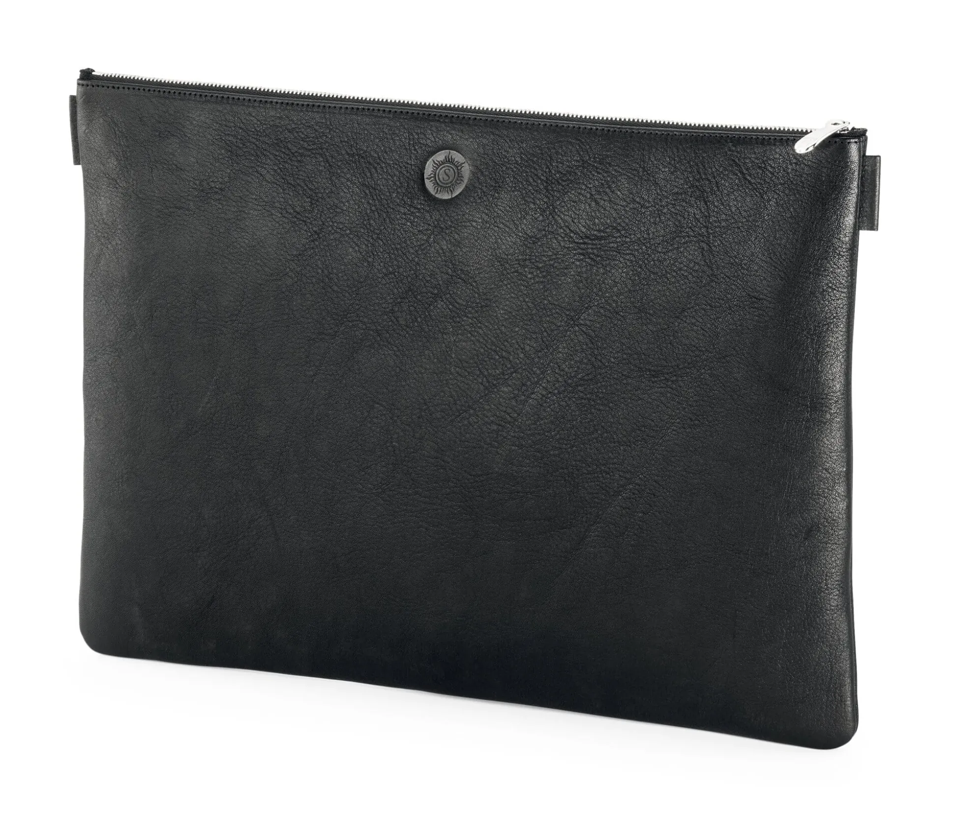 Rindleder grubengegerbt, ungefärbt bzw. schwarz im Fass durchgefärbt, Herkunft Deutschland. Reißverschluss Messing, silberfarben galvanisiert . Länge 36,5 cm, Breite 27 cm. Gewicht 345 g. Lieferung ohne Inhalt.
