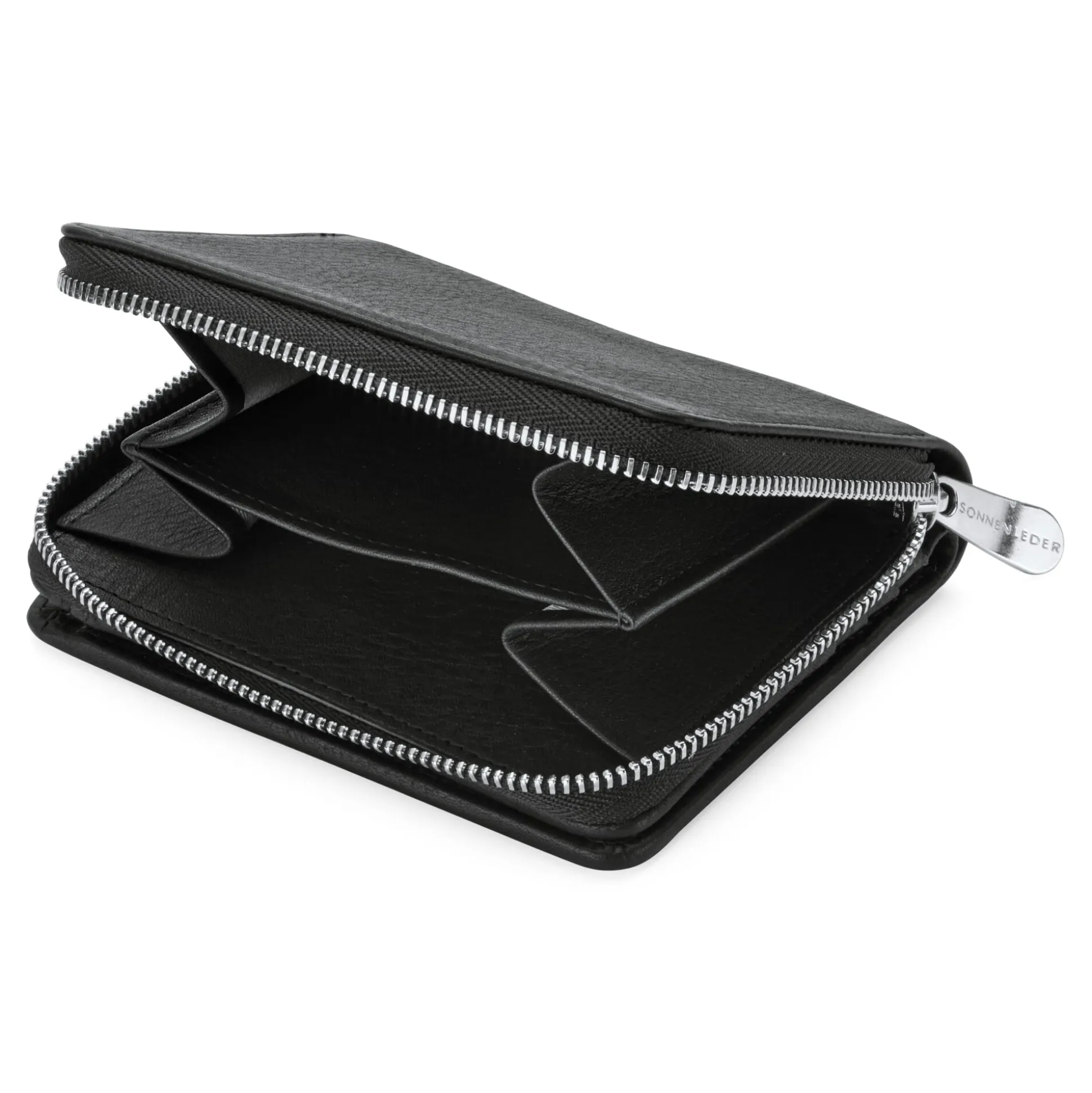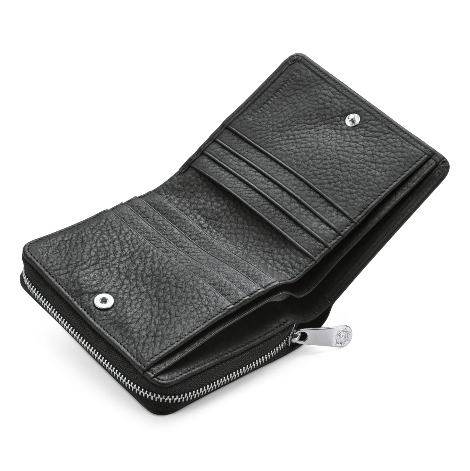 Eine kompakte, handliche Geldbörse, deren über drei Seiten laufender Reißverschluss zwei Münzfächer birgt. Die beiden Geldscheinfächer, sechs Kreditkartenfächer sowie zwei Steckfächer sind mittels Druckknopf zu schließen.
