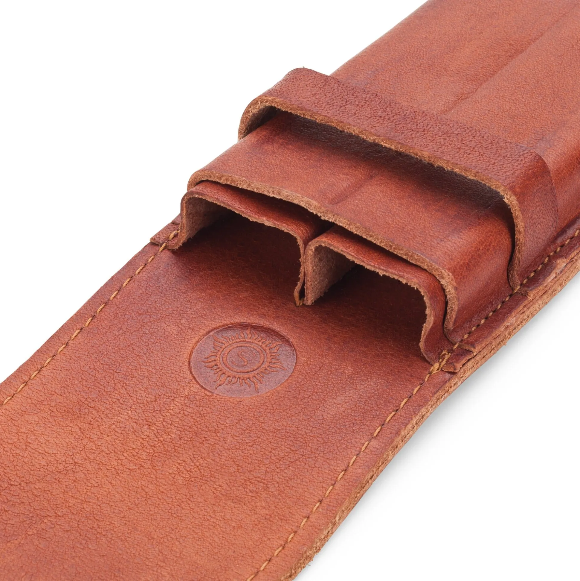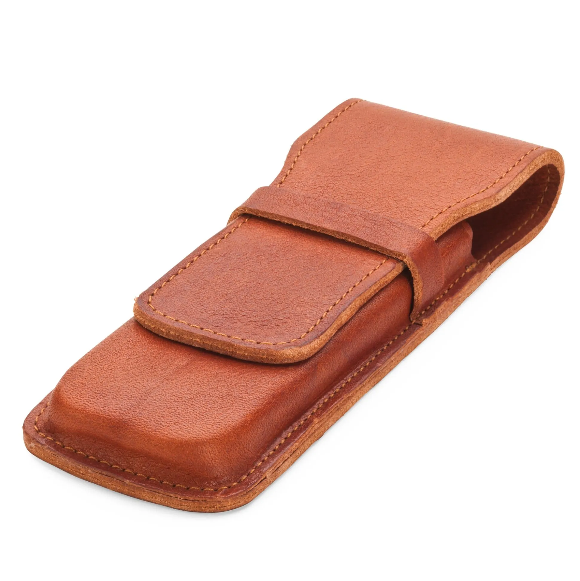 Köcher und Mäppchen zugleich für zwei Schreibgeräte ist dieser Etui-Typ, bei dem das harte und formstabile Leder durch eine sogenannte Wasserhärtung geformt wird, indem man einen oder eben zwei Holzstäbe in das nasse Leder steckt und anschließend austrocknen lässt.