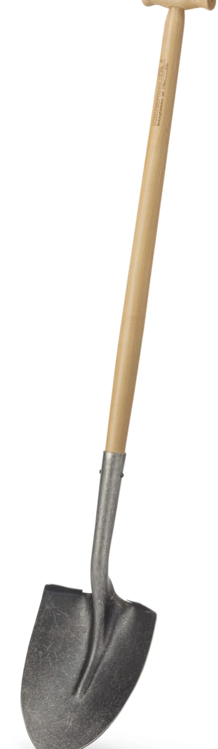 Blatt (L 28 × B 21,5 cm) aus Mangan-Bor-Stahl geschmiedet. Stiel Eschenholz (Herkunft Europa) lackiert. Mit T-Griff (Breite 12 cm). Gesamtlänge 122 cm. Gewicht 1,7 kg.