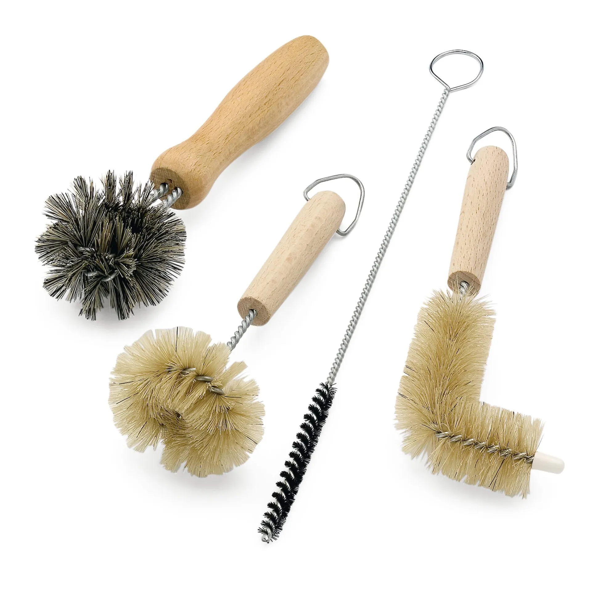 Vier kleine, in Küche und Bad vielfältig einsetzbare Spezialbürsten. Von links nach rechts: Eine Kugelbürste mit Rundum-Bestückung für sämtliche Ecken und Winkel gefliester Flächen, Armaturen etc. Längliche und runde Öffnungen können mit ihr problemlos erreicht werden. Besatz Fibre und Rosshaar. Bürstenkopf 5,5 cm Ø, Länge 17 cm. Eine Ausgussbürste zur gründlichen Reinigung von Ausgüssen und Zahnputzbechern. Besatz Schweineborste. Bürstenkopf 6 cm Ø, Länge 14,5 cm. Die Haarfangbürste mit hartem Polyamidbesatz behebt Abflussverstopfungen im oberen Bereich; sie kann tief in den Abfluss gesteckt werden und dort z.B. verklebte Haare entfernen. Bürstenkopf 0,8 cm Ø, Länge 27 cm. Die Überlaufbürste eignet sich zum Schrubben von Überläufen an Waschbecken. Besatz Schweineborste. Bürstenkopf 3 cm Ø, Länge 17 cm.