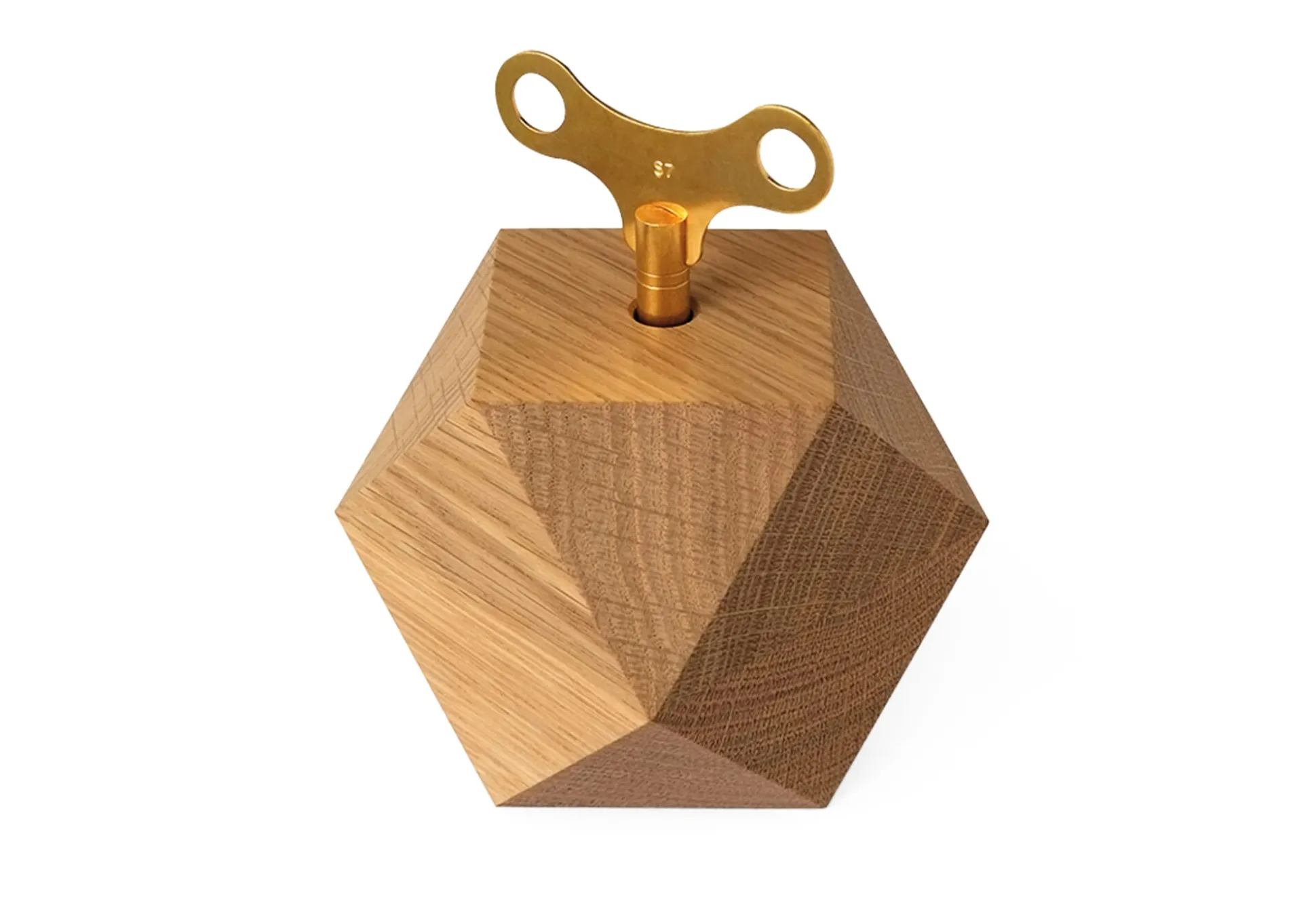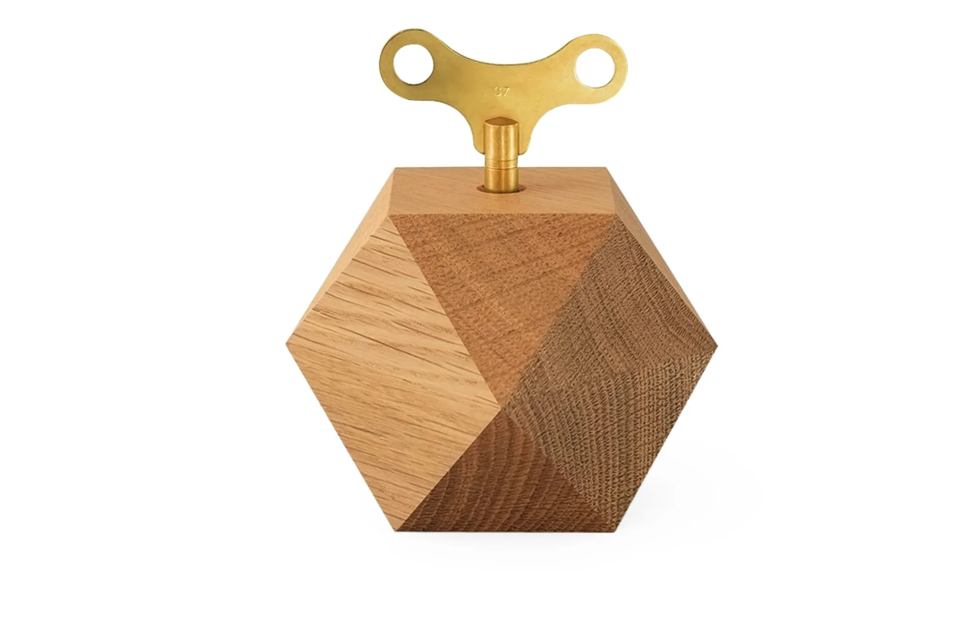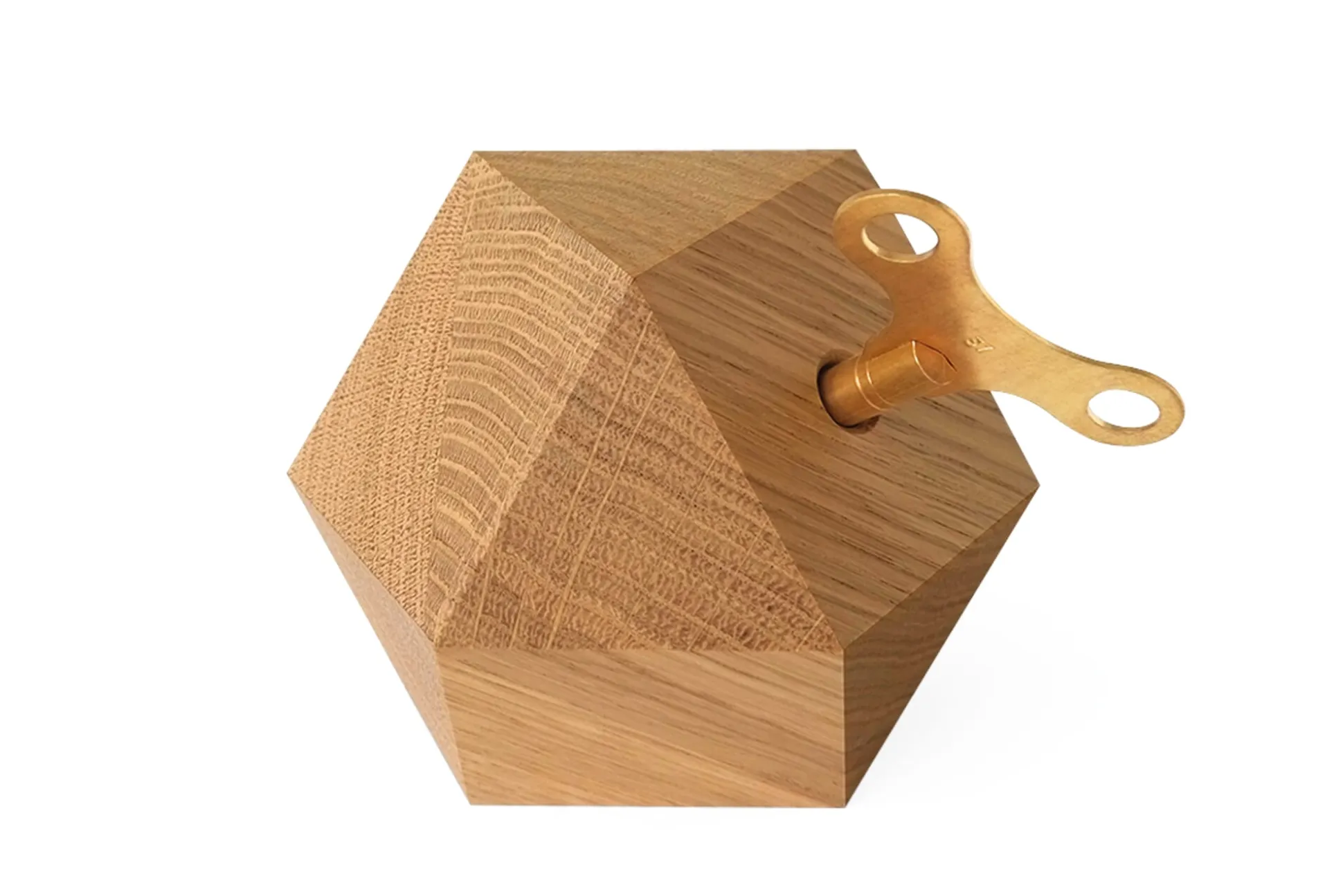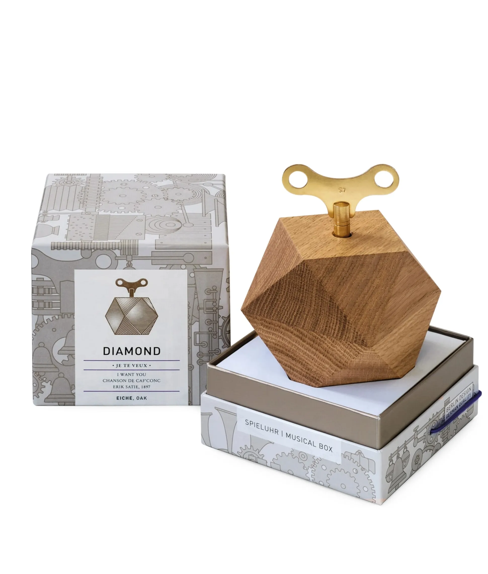 Durch den Facettenschliff erhält ein Rohdiamant seine einzigartige Aura. Die raffinierte geometrische Form der Spieluhr DIAMOND zitiert dieses jahrhundertealte Kunsthandwerk und macht sie so zum handschmeichelnden Objekt. Das achtzehnstimmige Musikwerk spielt die Melodie „Je te veux“ – ein Chanson des französischen Komponisten Erik Satie. Mit goldenem Schlüssel zum Aufziehen.