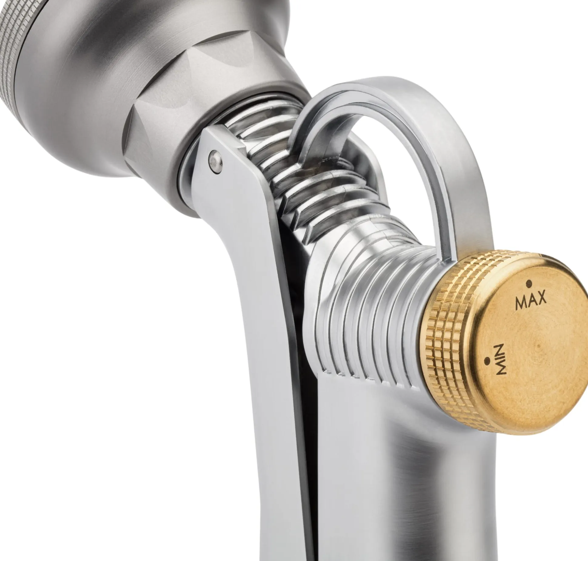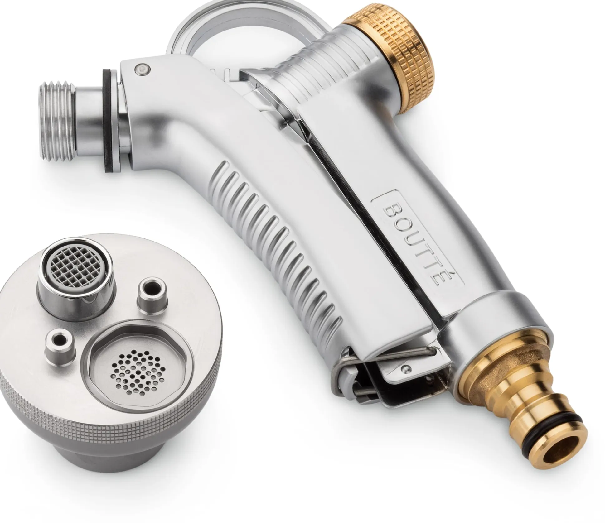 Brausekopf Aluminium, Korpus und Hebel Zamak eloxiert. Stellschraube und Anschlussstecker Messing. Grifflänge 8 cm, Brausekopf Ø 5,5 cm. Gewicht 570 g. Hergestellt in Frankreich.