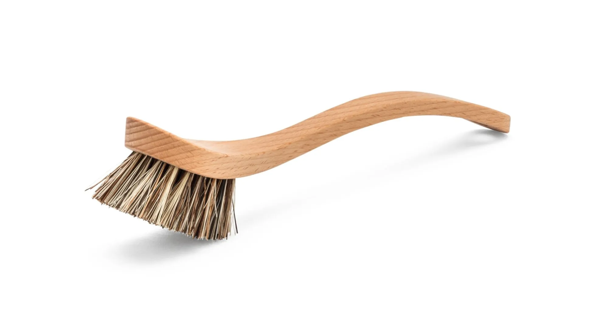 Anders als ihre gänzlich auf Funktion ausgelegten Kolleginnen zeigt sich diese Spülbürste aus geöltem Buchenholz in geradezu schwungvoll-eleganter Form – der deutsche Hersteller nennt sie intern auch Schwanenhalsbürste. Sie macht aber nicht nur optisch, sondern auch in der Anwendung eine gute Figur. Der Bürstenkopf ist etwas schlanker und gelangt so besser durch Glas- und Flaschenöffnungen. Ihre leicht ausgestellten Borsten kommen gut in Ecken und reinigen auch dort gründlich.