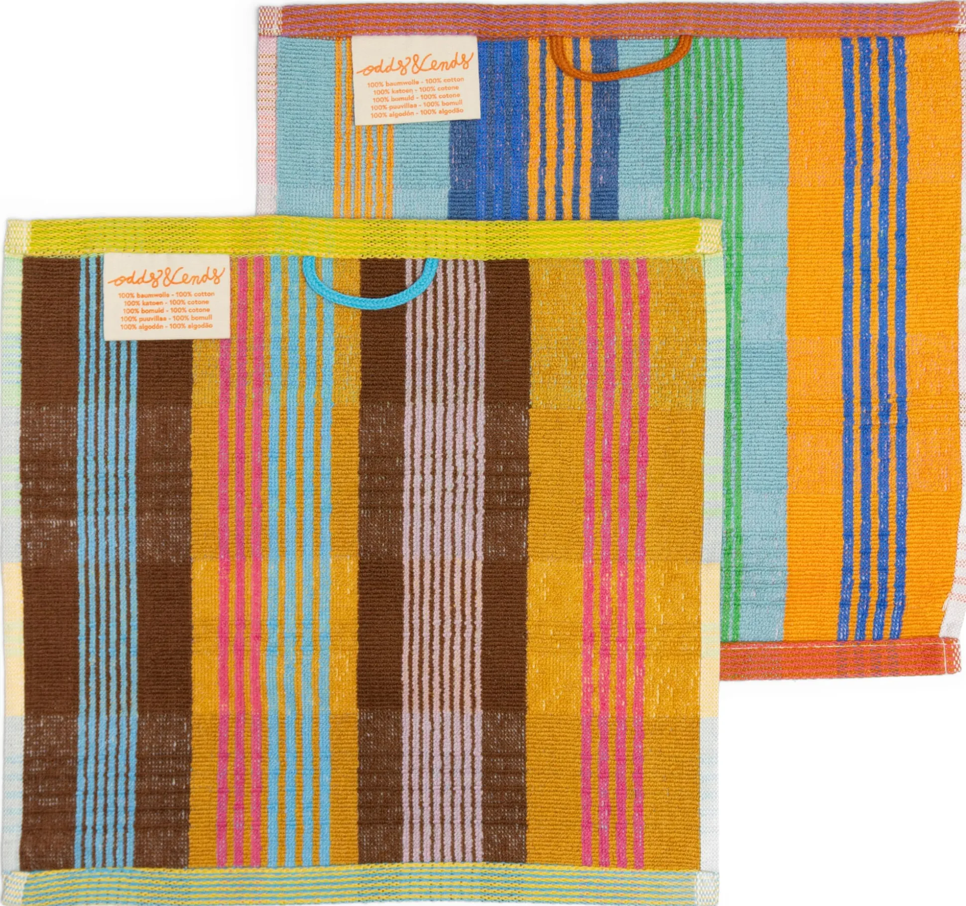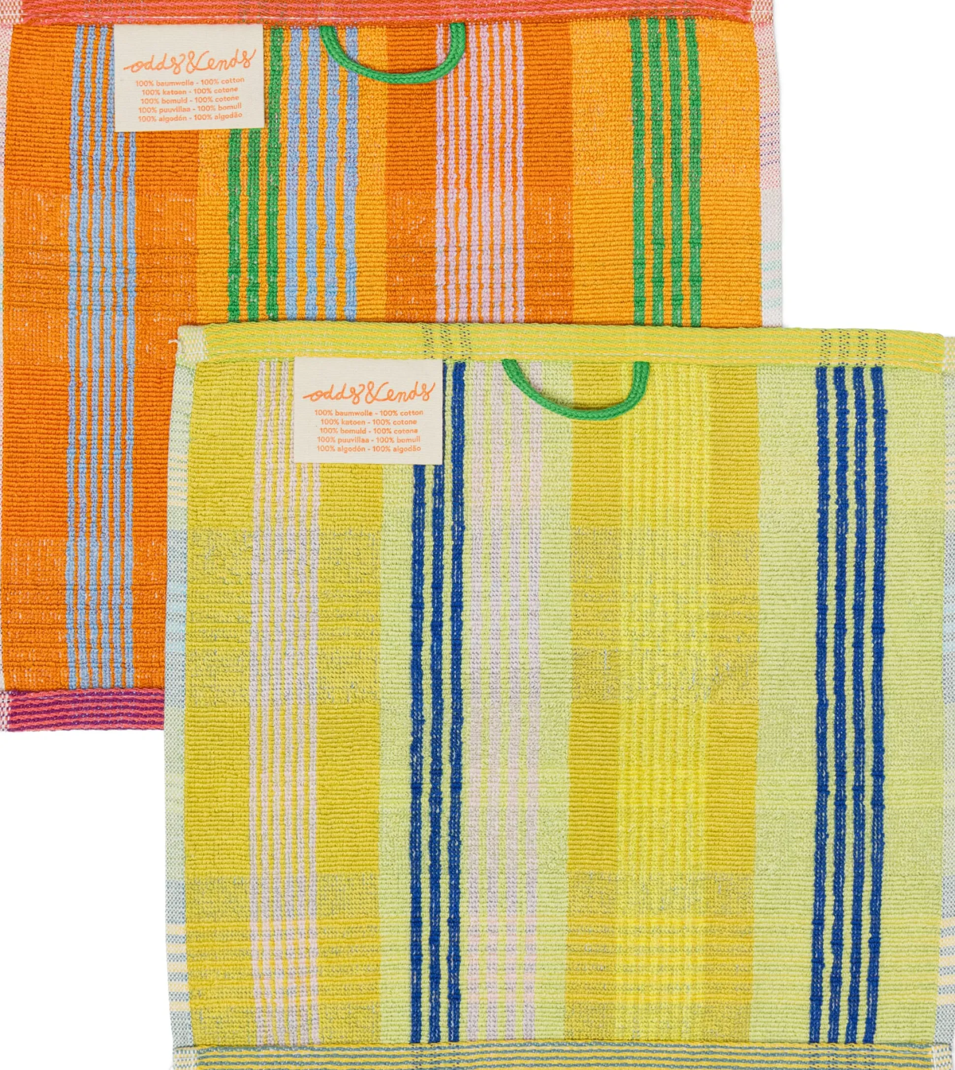 Die Tücher von Odds & Ends werden in Portugal gefertigt und sind an ihrem auf einer Jacquard-Maschine gewebten, gestreiften Saum leicht zu erkennen. Praktisch alle Tücher sind mit einem Aufhänger versehen und schnelltrocknend.
