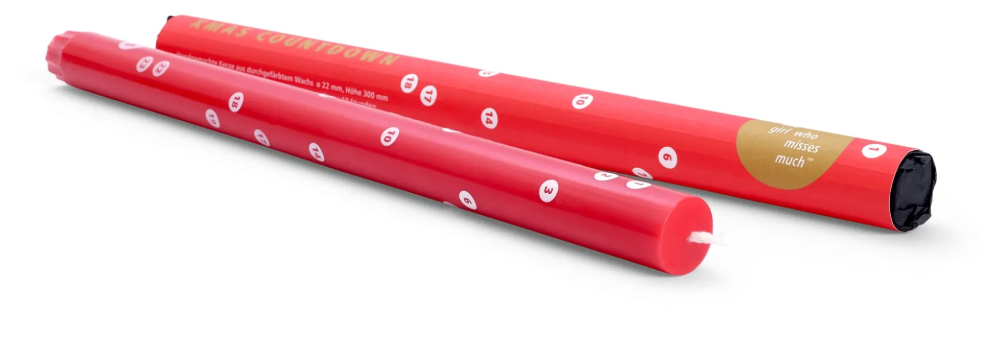 Die 30 cm langen Kerzen sind paraffinfrei, kommen aus fairem Handel, mit einem Docht aus reiner Baumwolle und haben eine Brenndauer von 10 Stunden. Die Zahlen werden im Siebdruckverfahren auf die Kerze gebracht. Ihre Einzelverpackung aus offenem Designpapier zeigt 1:1 was sich im Inneren verbirgt. Eine ebenso schöne wie unaufgeregte Alternative zum klassischen Adventskalender und Mitbringsel für die Vorweihnachtszeit.