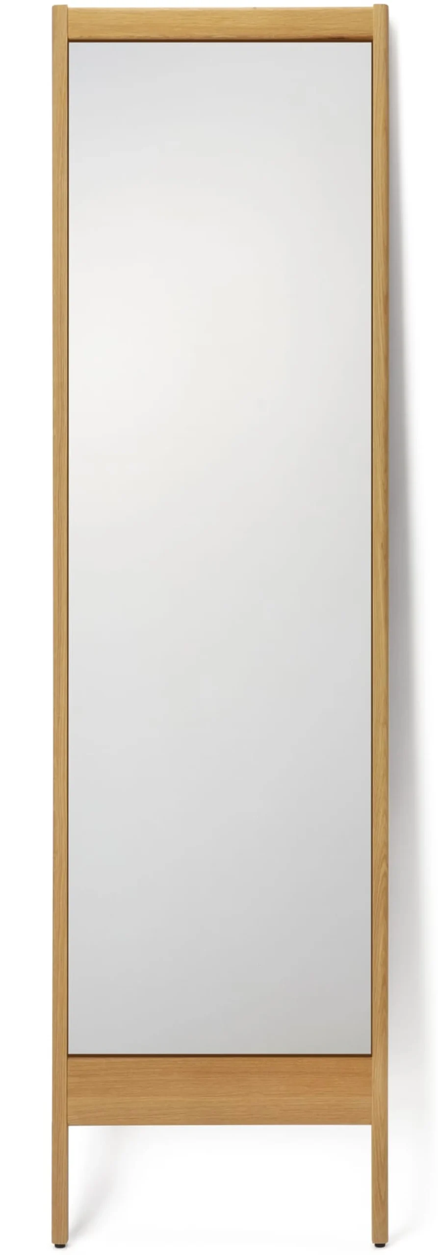 Der Standspiegel gehört zu einer Serie an Kleinmöbeln von Form & Refine, deren klare Gestaltung durchaus eine Nähe zur Tradition der Shaker-Möbel erkennen lässt. Dies bietet den Vorteil, dass sich der Spiegel in verschiedenste Wohnstile und Wohnbereiche einfügt. Der Hersteller fertigt den Spiegelrahmen und die Füße aus massivem, geöltem Eichenholz.