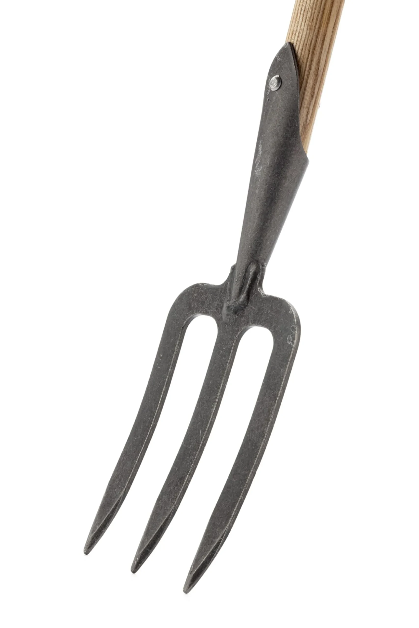 Dreizinkige Gabel aus Mangan-Bor-Stahl geschmiedet. Griff Eschenholz lackiert. Gabel Länge 15,5 cm, Breite 11,5 cm. Zinken Breite 2 cm. Gesamtlänge 58 cm, Gesamtbreite 12 cm. Gewicht 640 g.