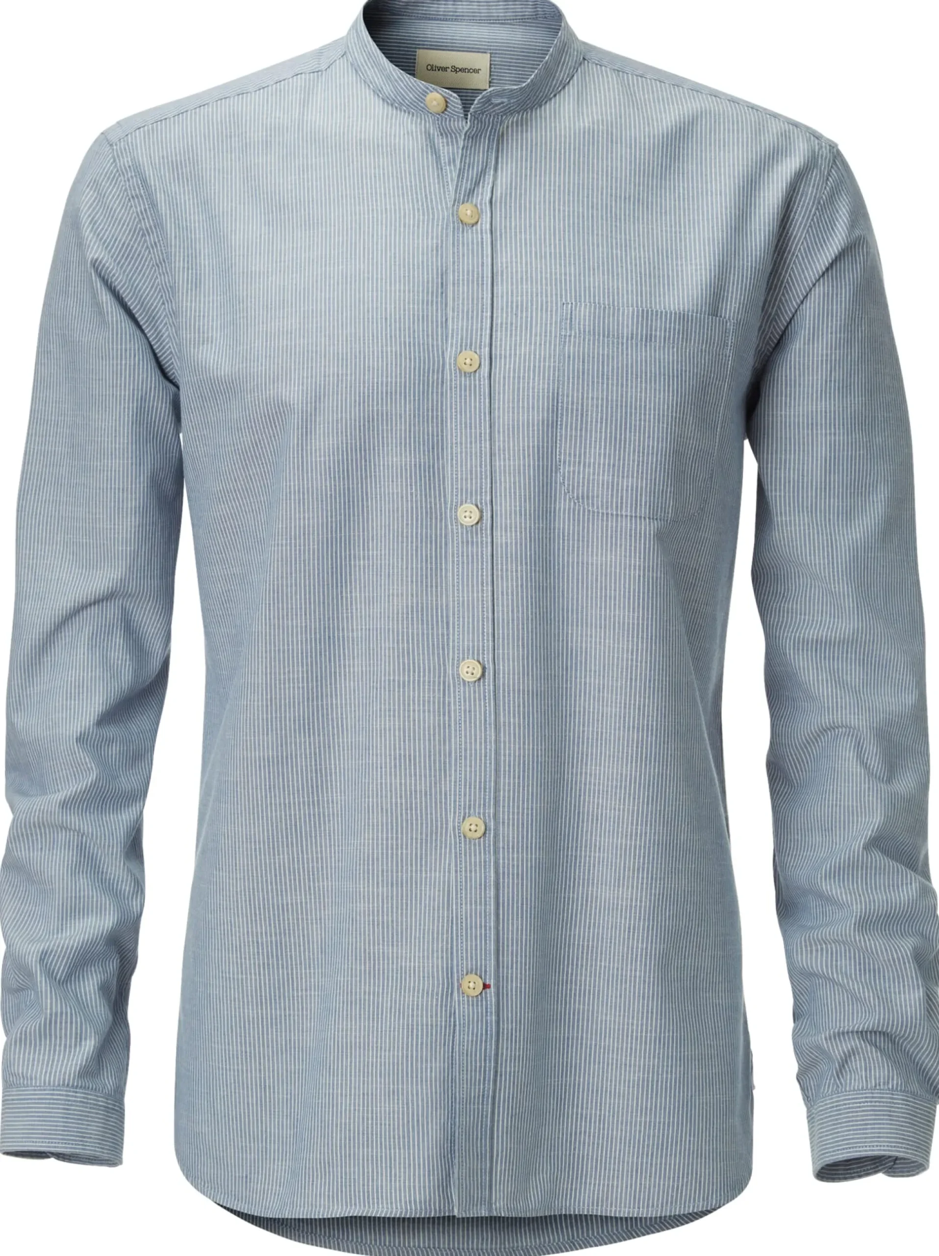 Stehkragenhemd mit gedoppelter Passe, mustergetreu aufgesetzter Brusttasche und gerundetem Saum. Das Dessin zeigt ein feines Streifenmuster.