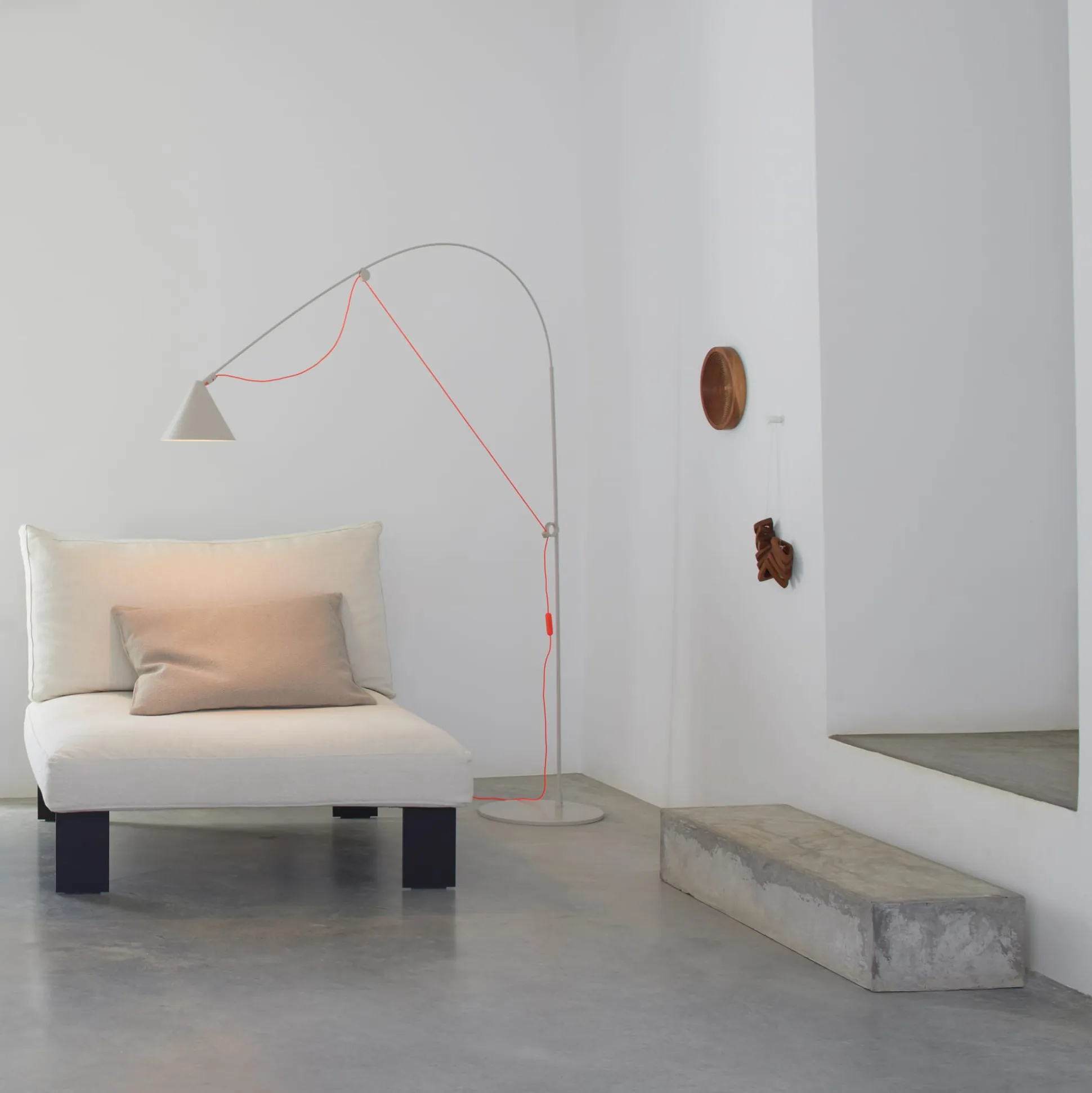 Das zentrale Merkmal der AYNO-Leuchtenfamilie ist ein Fiberglasstab, der durch das Leuchtenkabel zum Bogen geformt wird. Die Eigenspannung des Stabes ermöglicht eine gelenkfreie Konstruktion. Durch das Verschieben der beiden Verstellringe an Fuß und Kopf wird der Fiberglasstab in die gewünschte Position gebogen und das Licht in die benötigte Richtung gelenkt. Das Kabel spannt somit den Stab zu einem Bogen, dessen Radius sich durch die Verstellringe beliebig variieren lässt. Die Feinjustierung, also schlussendlich die exakte Ausrichtung des Lichts, erfolgt mit dem verstellbaren Leuchtenschirm.