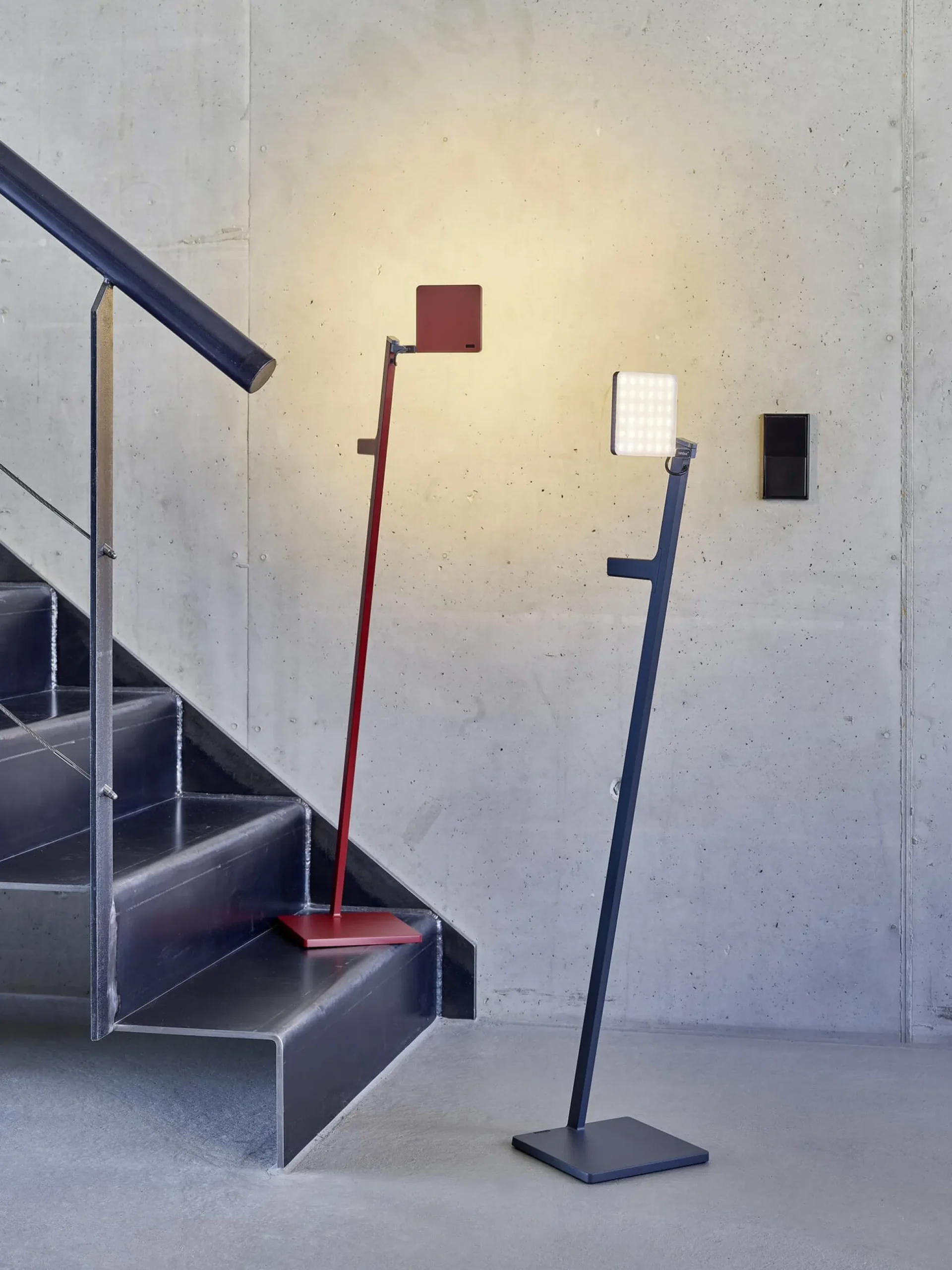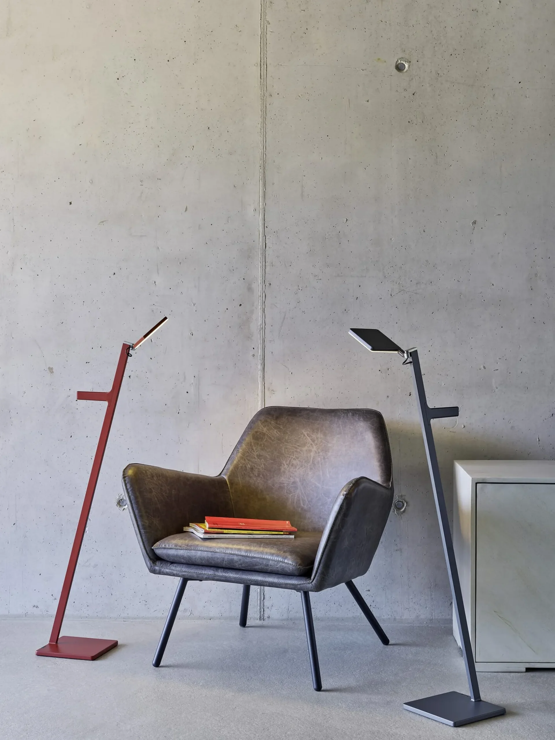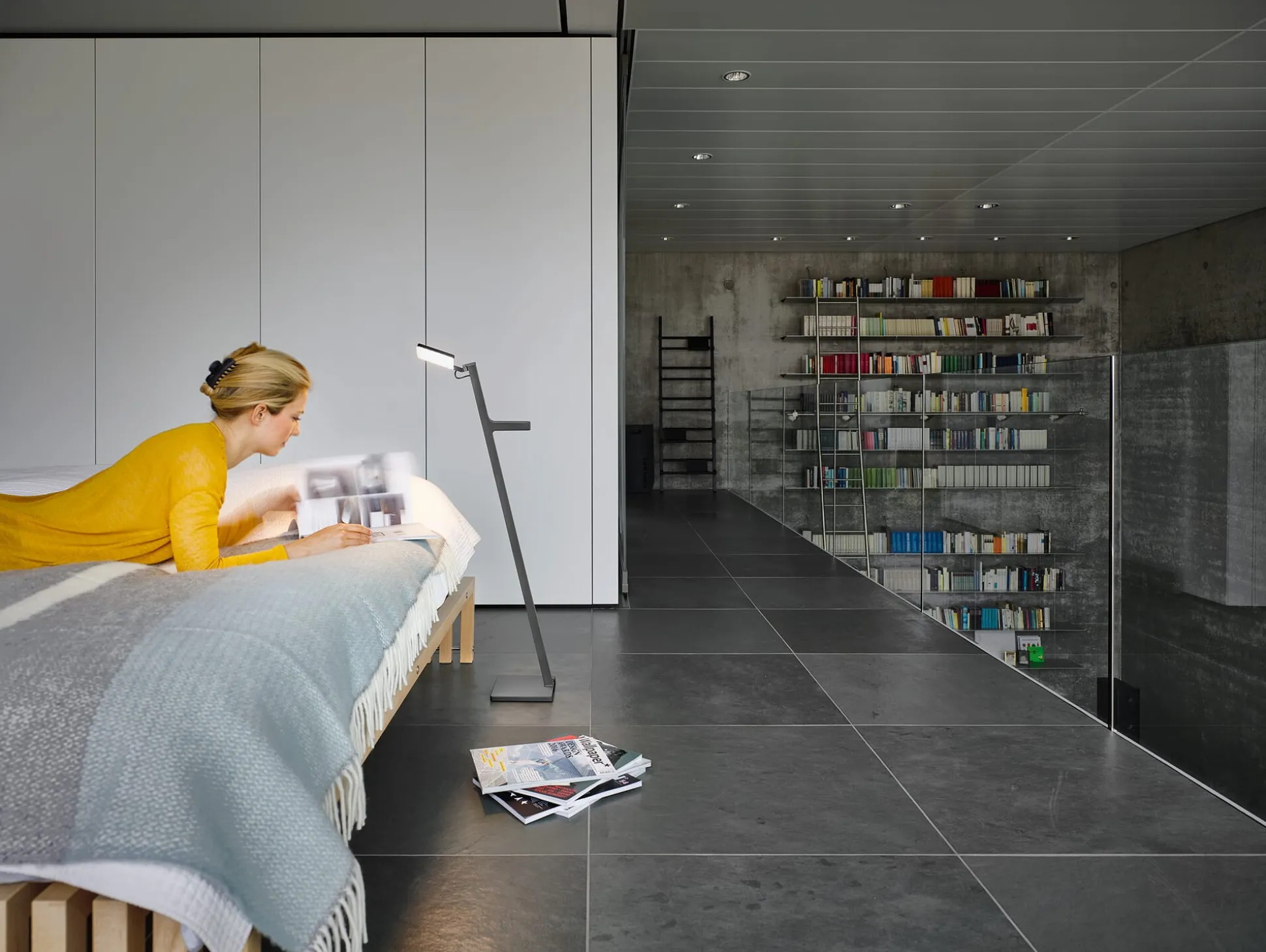Der Leuchtenkopf ist mit einem Diffusor aus Polycarbonat ausgestattet und über einen 270°-3D-Gelenkkopf mit dem Leuchtenstab verbunden. Diese gute Entblendung und Beweglichkeit ergänzen die formale Flexibilität der Leuchte. Die technisch präzise ausgelegte Gestensteuerung macht die Leuchte zudem intuitiv bedienbar.