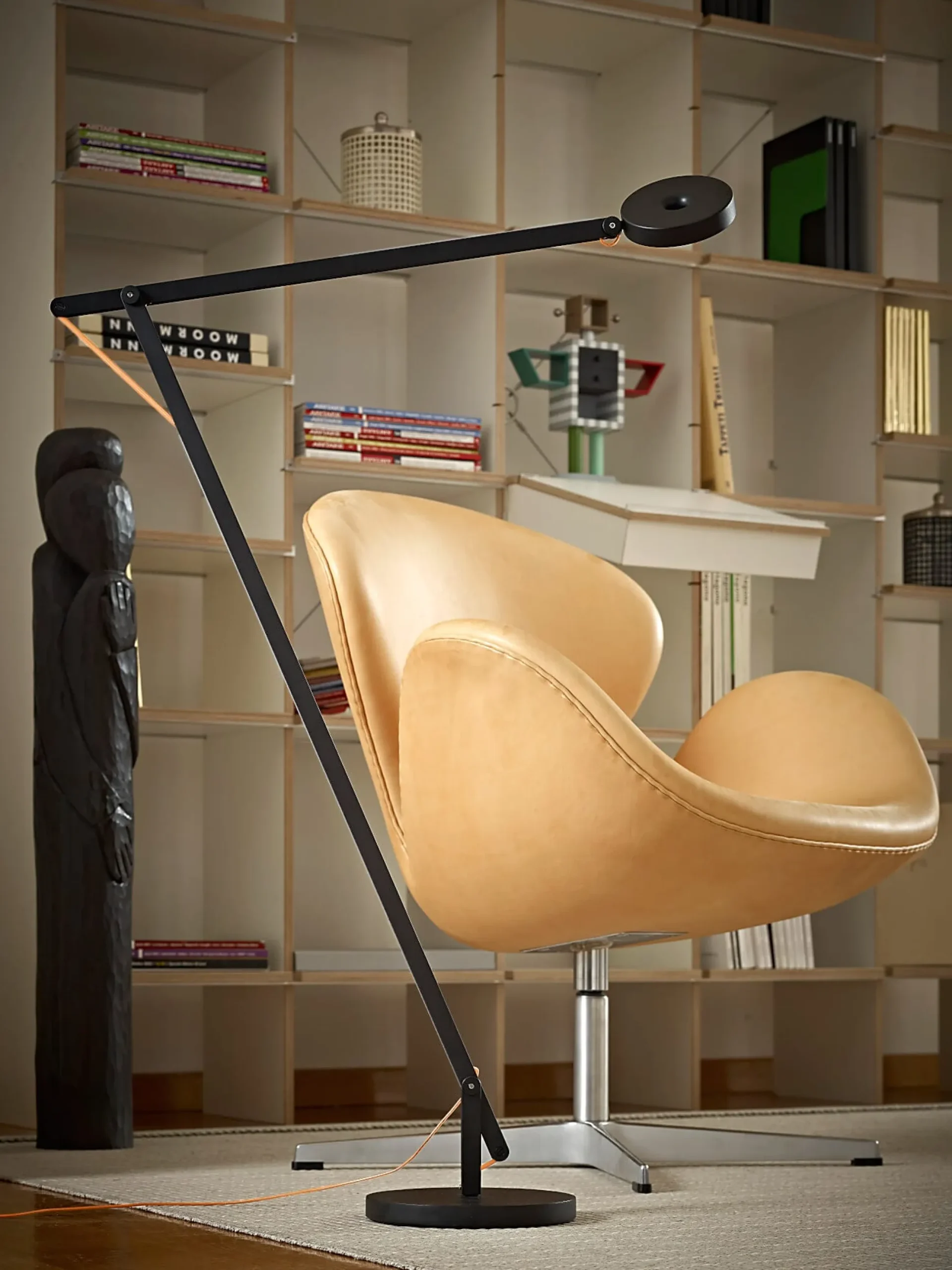 Feingliedrige Struktur aus Aluminium, mit höherem Gelenkarm unten, weit orientierbarem Ausleger und schwenkbarem Leuchtenkopf mit zentraler Öffnung und leistungsstarker LED – STRING ist eine ideale Leuchte am Lese- und Arbeitsplatz und verfügt über die sogenannte Dim-to-warm-Funktion. Bedeutet, dass der integrierte (touch) Dimmer (im Kopf integriert) das erzeugte Licht von kühl und hell nach wärmer und dunkler herunterregelt. Die Bewegung der beiden Aluminiumarme wird durch ein elastisches und farbig ummanteltes Kabel gesteuert, was eine feine und detaillierte Beweglichkeit der Gelenke ermöglicht.