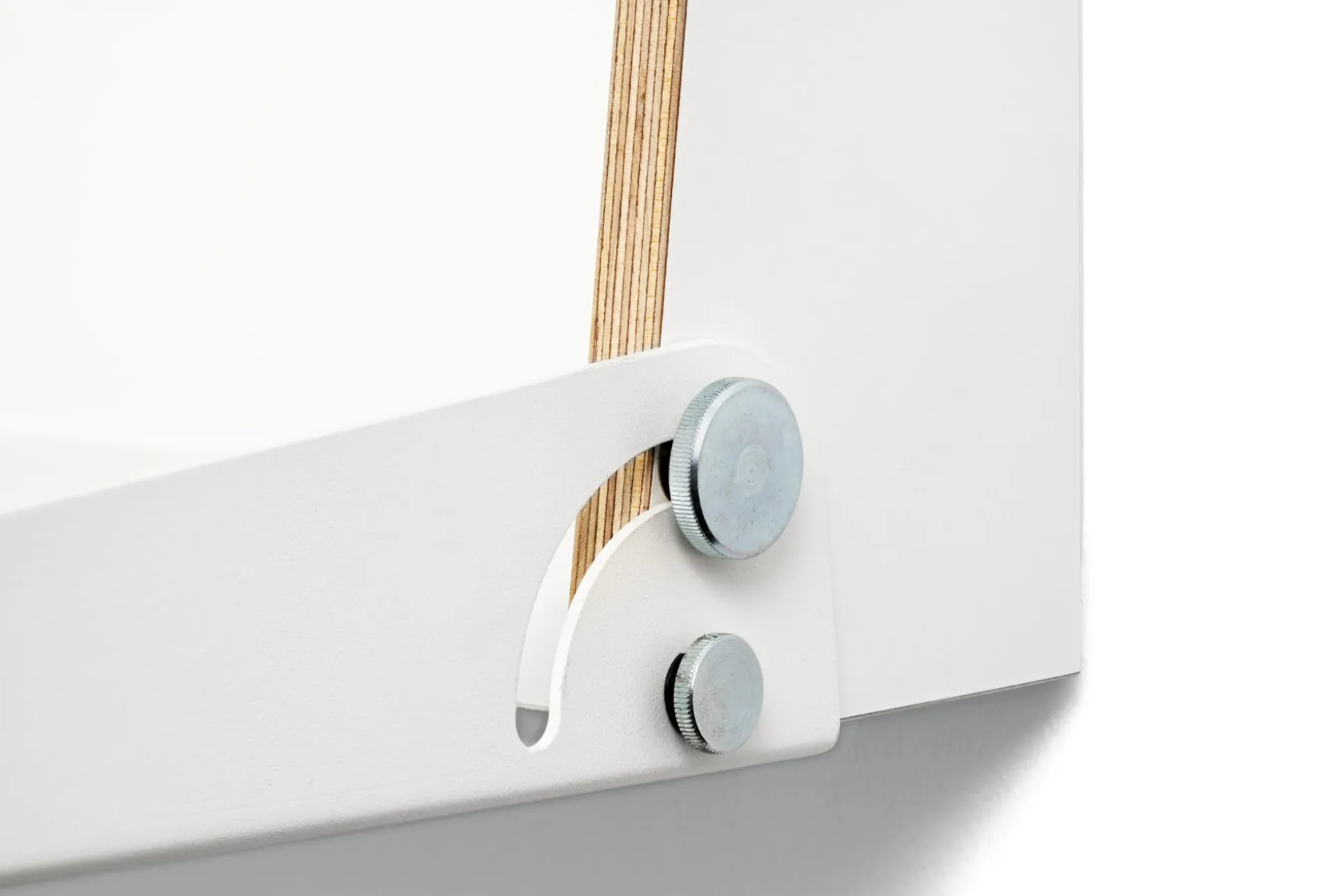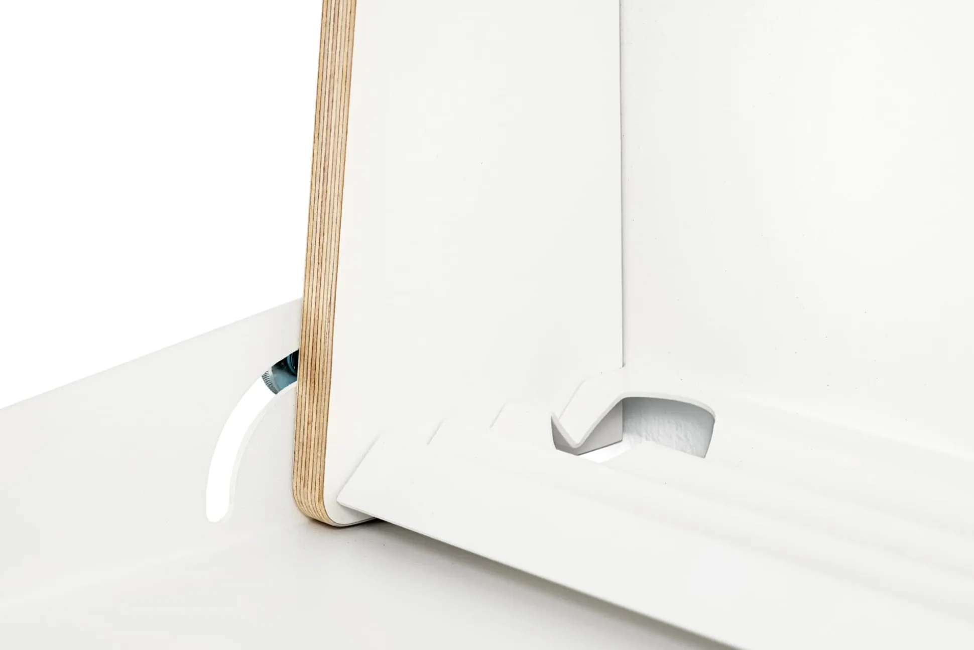 Material: Korpus: Birke Multiplex, Esche furniert (Herkunft: Osteuropa) bzw. beidseitig weiß melaminharzbeschichtet (Bei den aus dem Karosseriebau stammenden Multiplexplatten sind Farb- und Strukturunterschiede sowie vereinzelte kleine Druckstellen möglich.); Rückwand: Stahlblech, pulverbeschichtet; Arbeitsfläche: Aluminiumblech, pulverbeschichtet