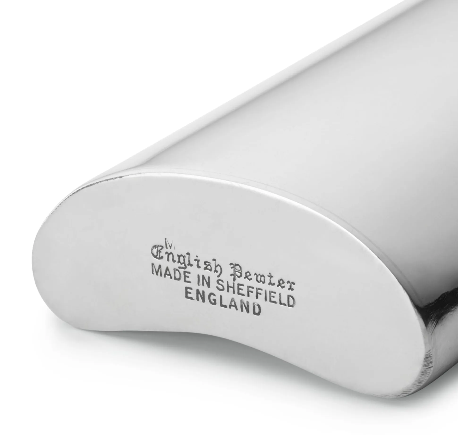 Aus einer Zinnlegierung. Volumen 88 ml. Höhe 12,5 cm, Breite 5,5 cm, Tiefe 2 cm. Gewicht 125 g.