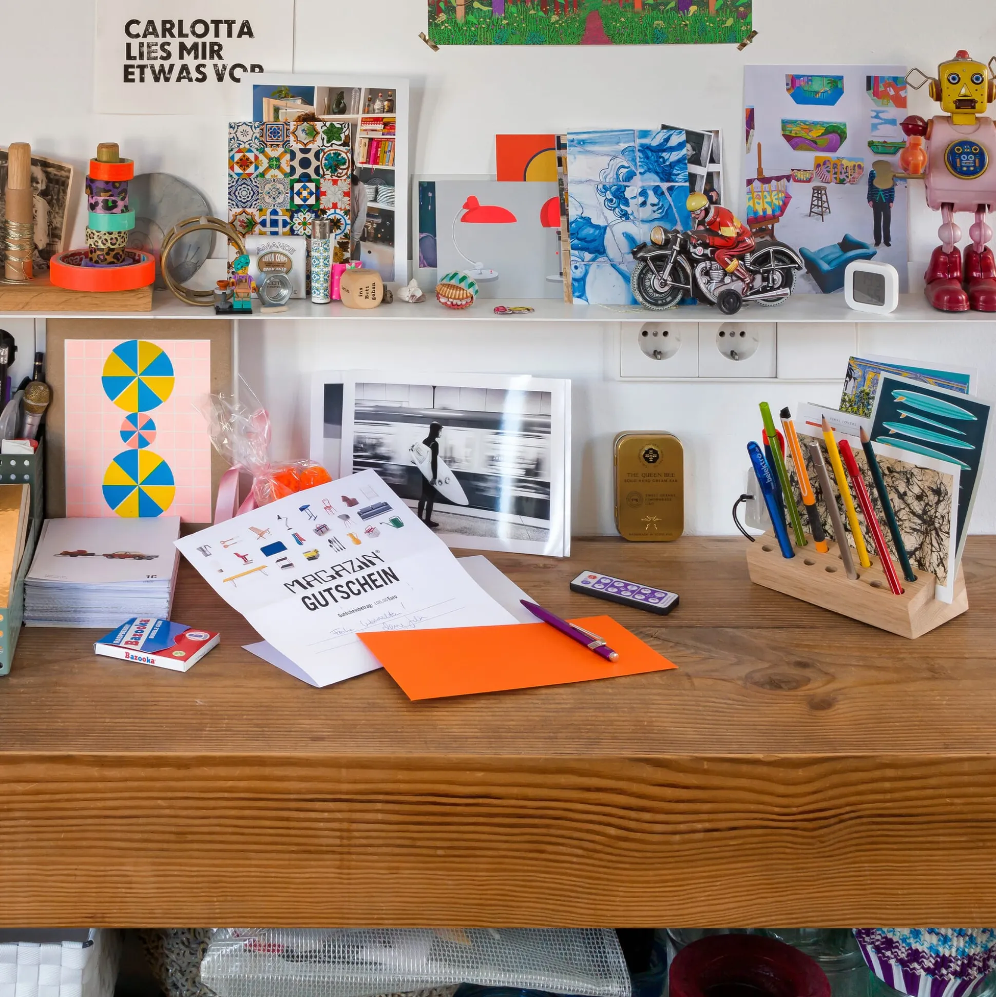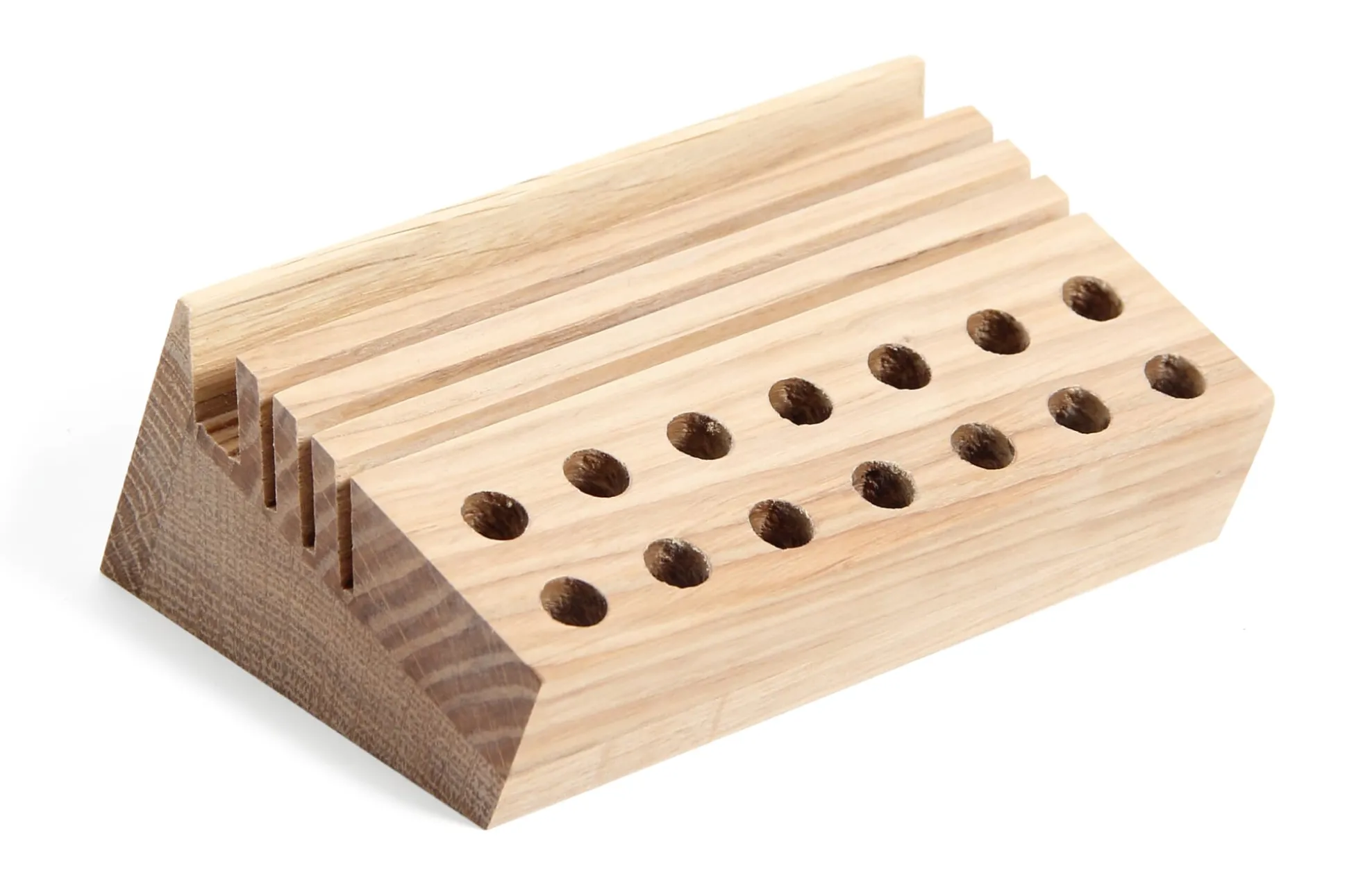 Stifte, Papier, Karten – alles ist gut sortiert und organisiert auf dem Schreibtisch. Der kleine analoge Organizer ist aus massiver Eiche gefertigt.