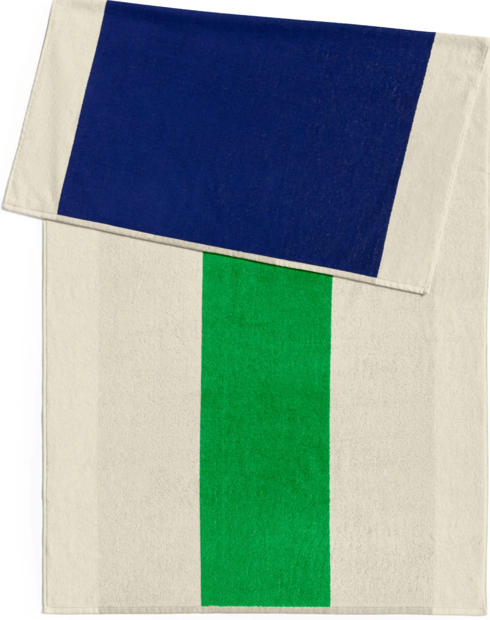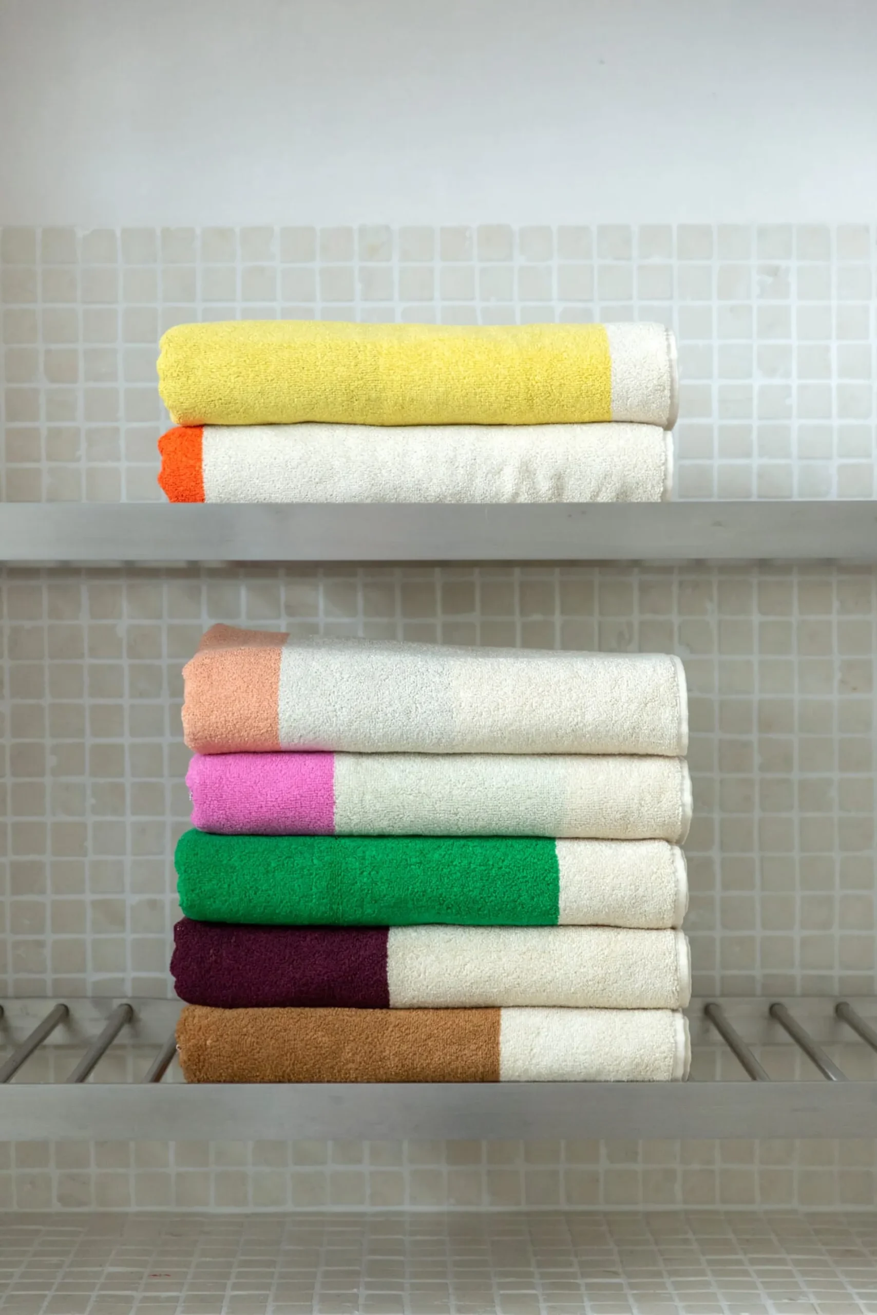 Genau wie die Strandhütten von Le Havre sind diese farbstarken Frottiertücher und auch ihre Vorder- und Rückseiten immer unterschiedlich in Farbgebung und Streifenmuster, lassen aber in Kombination keinen Zweifel daran, dass sie zusammengehören.