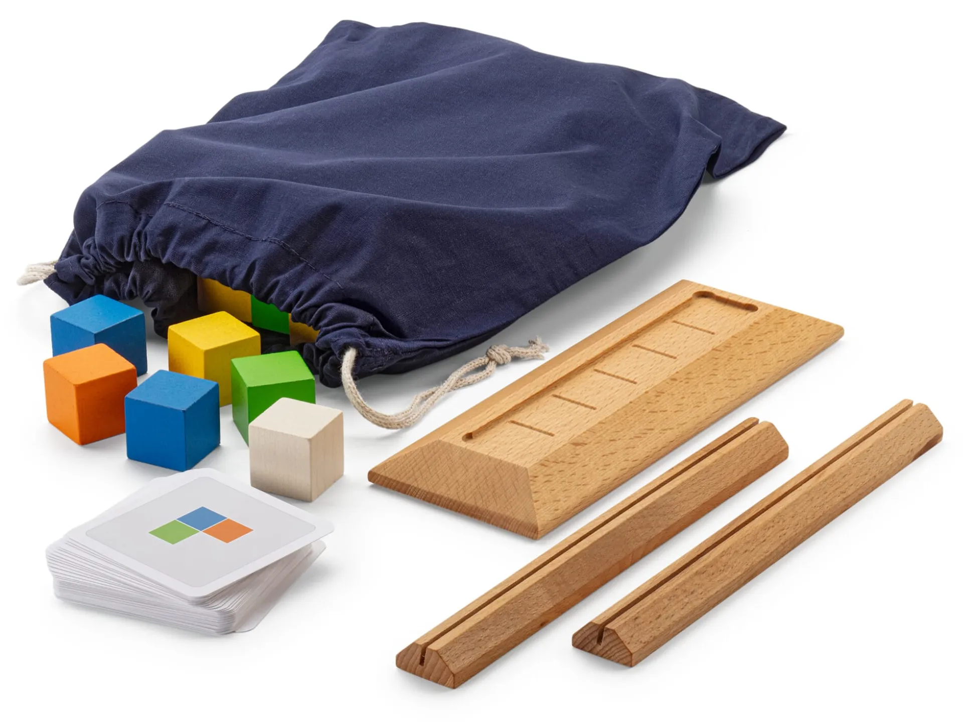 Für 2 Spieler*innen. Ab 8 Jahre. 1 Spielbrett (Länge 20 cm, Breite 7,5 cm) aus geöltem Buchenholz, mit Vertiefung. 29 Buchenholzwürfel, farbig lackiert, Kantenlänge 2,5 cm. 2 Kartenhalter aus geöltem Buchenholz, 36 Aufgabenkarten, 1 Baumwollbeutel. Gesamtgewicht 570 g.
