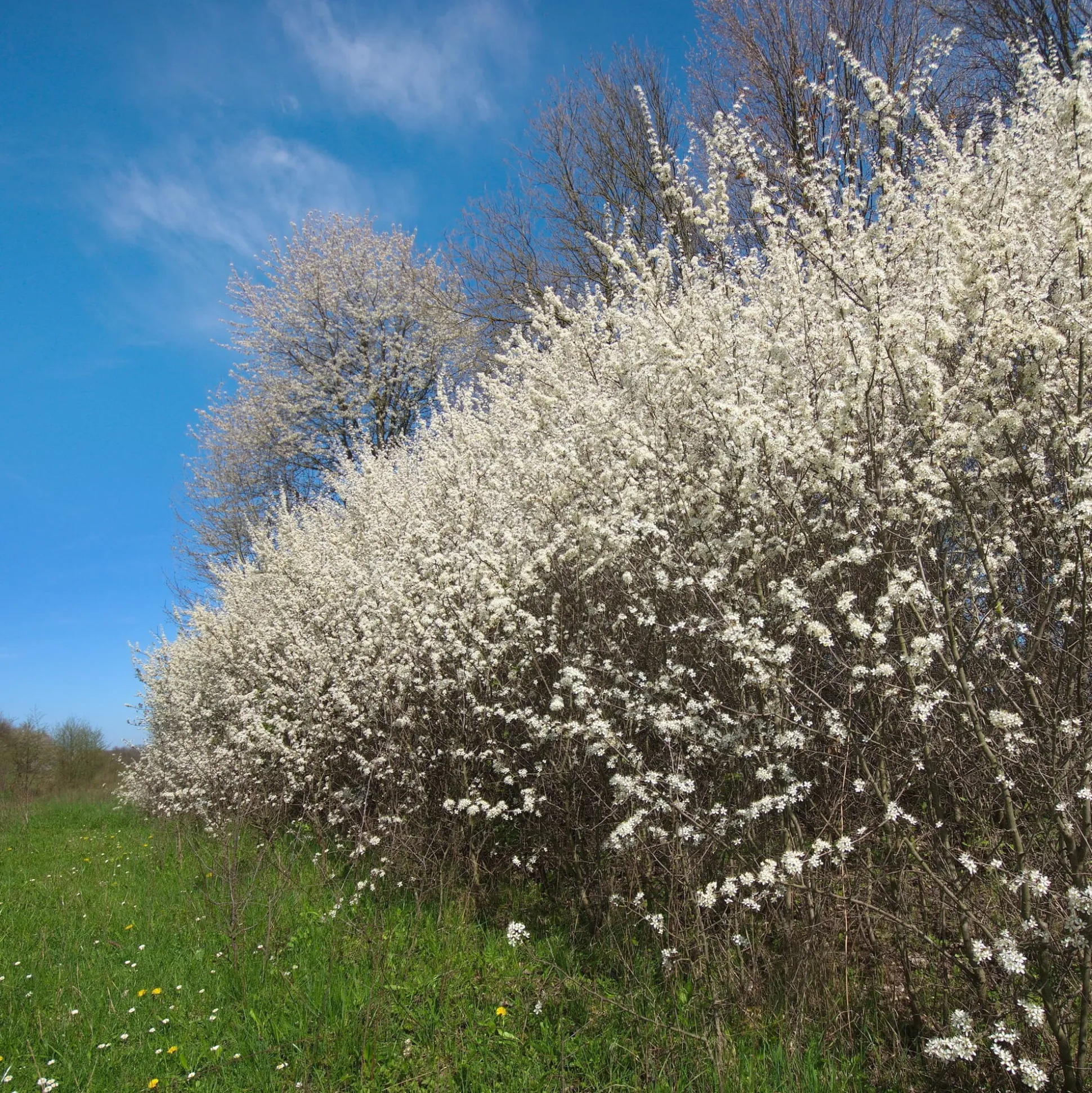 Schon zu Römerzeiten in Kultur und eines der attraktivsten Nährgehölze für Vögel und Insekten. Der weißen Blütenpracht im April und Mai folgen die runden, blauen Schlehenfrüchte, die erst nach Frosteinwirkung genießbar werden und dann zu Saft, Wein, Likör oder Marmelade verarbeitet werden können. Roh schmecken sie sehr sauer.