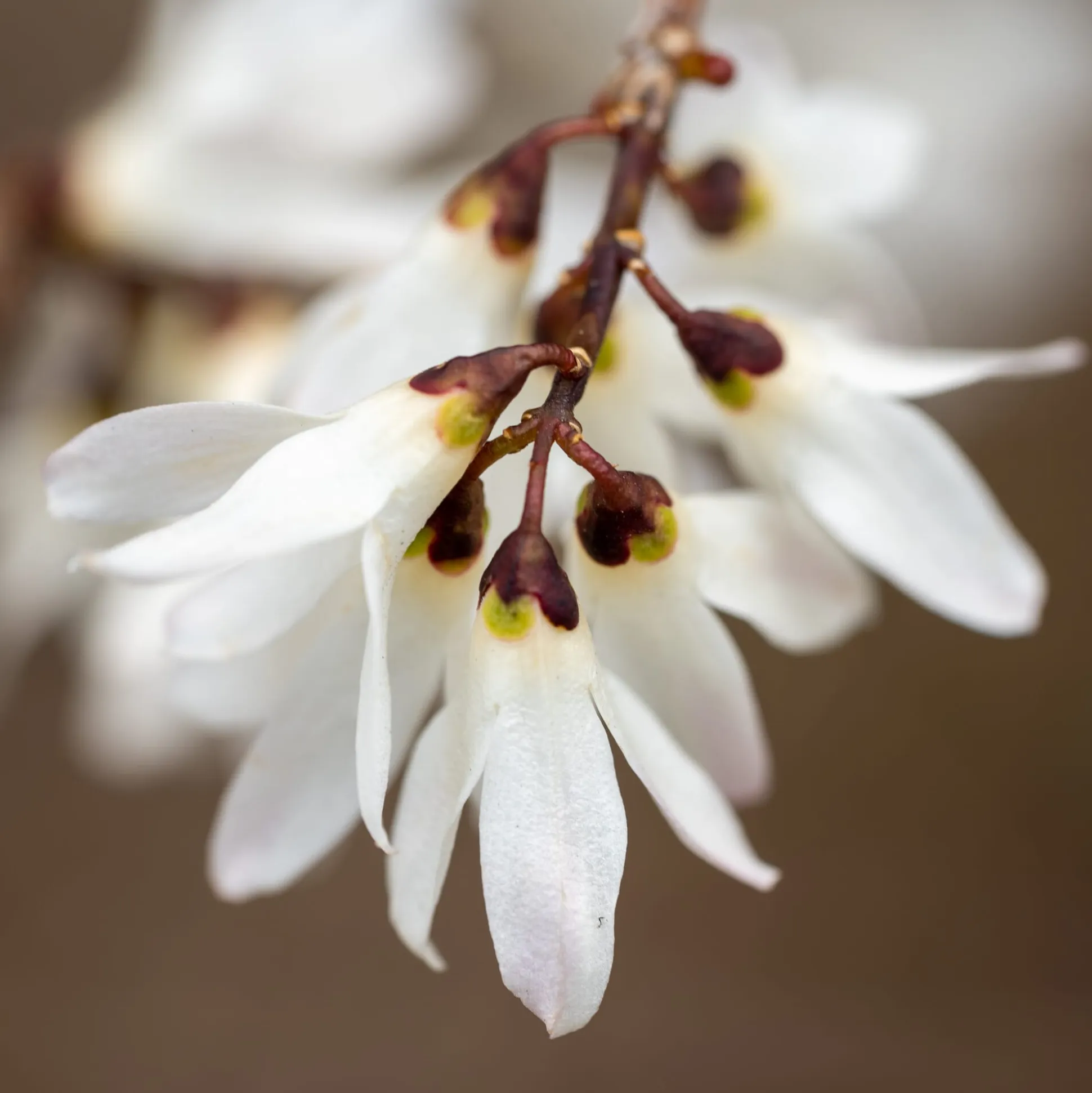 Die Winterblüte zeigt ihre duftenden Blütenglocken bei milder Witterung bereits im Dezember. Sie sind von cremegelber Farbe mit rötlicher bis purpurfarbener Mitte und halten bis in den März. Schon ein kleiner Blütenzweig in der Vase erfüllt einen ganzen Raum mit Wohlgeruch. Auch Blätter und Rinde duften, sodass die sonst eher unauffällige Pflanze das ganze Jahr über attraktiv ist. Sie bevorzugt einen nährstoffreichen, nicht zu schweren Boden am windgeschützten, warmen Standort; junge Pflanzen sollten einen Winterschutz bekommen. Etwa 3 m hoch und 2 m breit werdend.