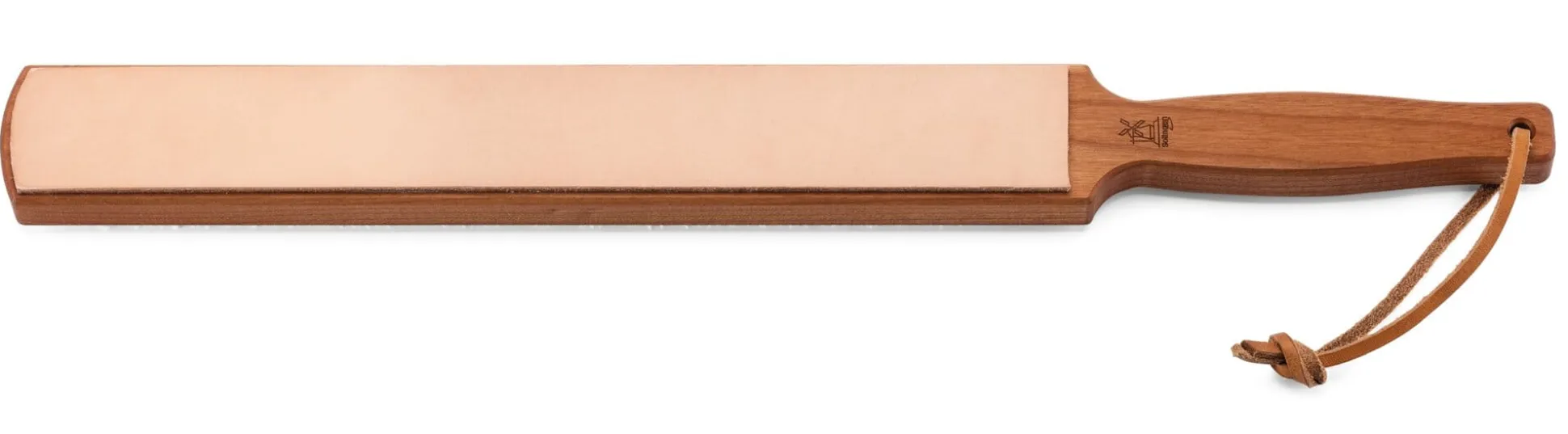 Der Streichriemen wird im Anschluss an das Schärfen der Küchenmesser auf dem Wasserschleifstein eingesetzt, um die Klingen fein zu entgraten und sauberzuschleifen – Polierschleifen, nennt das der Messerfachmann. Der Holzkörper aus gedämpftem und glatt geöltem Kirschbaumholz ist zur einen Seite mit einem vegetabil gegerbten, weichen Rindleder (20 Micron) bezogen. Auf der rauen Seite ist ein chromgegerbtes, härteres Rindleder mit Diamantine-Pulver bestäubt, einem feinen Aluminiumoxid-Schleifpulver (10 Micron). Die weiche Seite bleibt naturbelassen und dient dem Feinabzug der Messerklingen. Da es von Natur aus einen leichten Fettanteil mitbringt, bleibt das Leder lange geschmeidig.