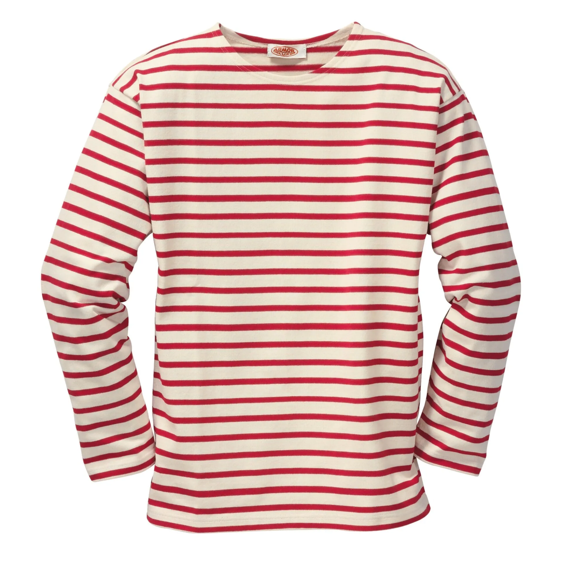 Auf den ersten Blick sieht er aus wie ein Matrosenshirt. Ein genauer Blick auf das Material offenbart den entscheidenden Unterschied: Bei diesem sommerlichen Pullover kommt ein mittelschwerer Jersey mit körnigem Griff zum Einsatz. Die Baumwolle dafür stammt aus kontrolliert biologischem Anbau. Die Nähte an allen Säumen sind gedoppelt, der Halsausschnitt ist ohne Bündchen konfektioniert.
