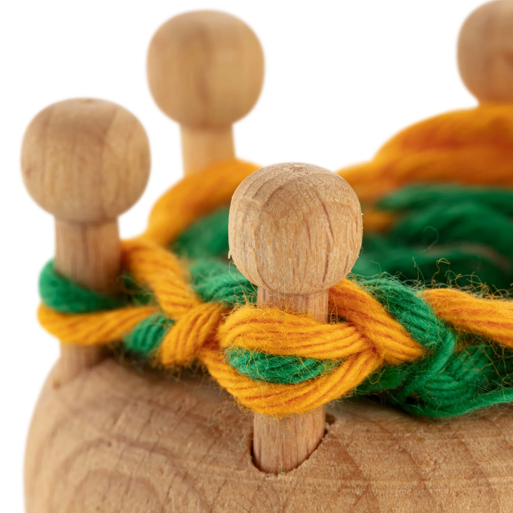 Korpus aus Buchenholz. Mit 6 Maschen-Pins. Ø außen 5 cm, innen Ø 2 cm; Höhe inkl. Pins 5,5 cm, ohne Pins 4 cm. Häkelnadel aus Bambus, Stärke 3,75 mm. Garn aus Baumwolle, in 7 verschiedenen Farben, Länge jeweils 1 m. Gesamtgewicht 50 g. Mit Anleitung. Ab 7 Jahre.