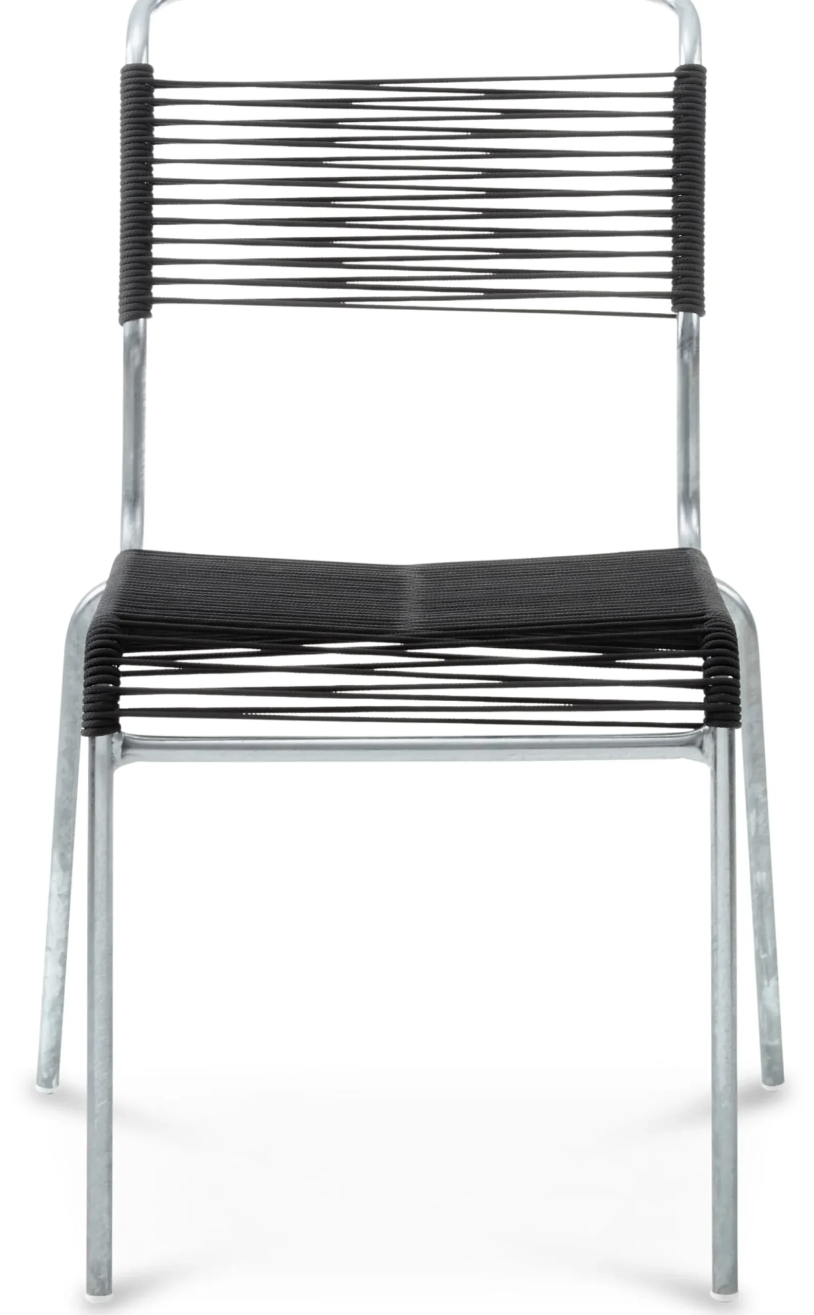 Robuster, feingliedriger, stapelbarer Stuhl – in dieser Version mit einer aus OceanYarn® produzierten Seilbespannung. Diese ist elastisch, was für besonderen Sitzkomfort sorgt, da sie sich der individuellen Belastung durch Körpergewicht (max. Belastungsgewicht 120 kg) und Sitzhaltung anpasst. Das hochwertige Seilmaterial besitzt eine textile Struktur. Das feuerverzinkte Stahlrohrgestell ist sehr robust und gegen alle Witterungsbedingungen gefeit.