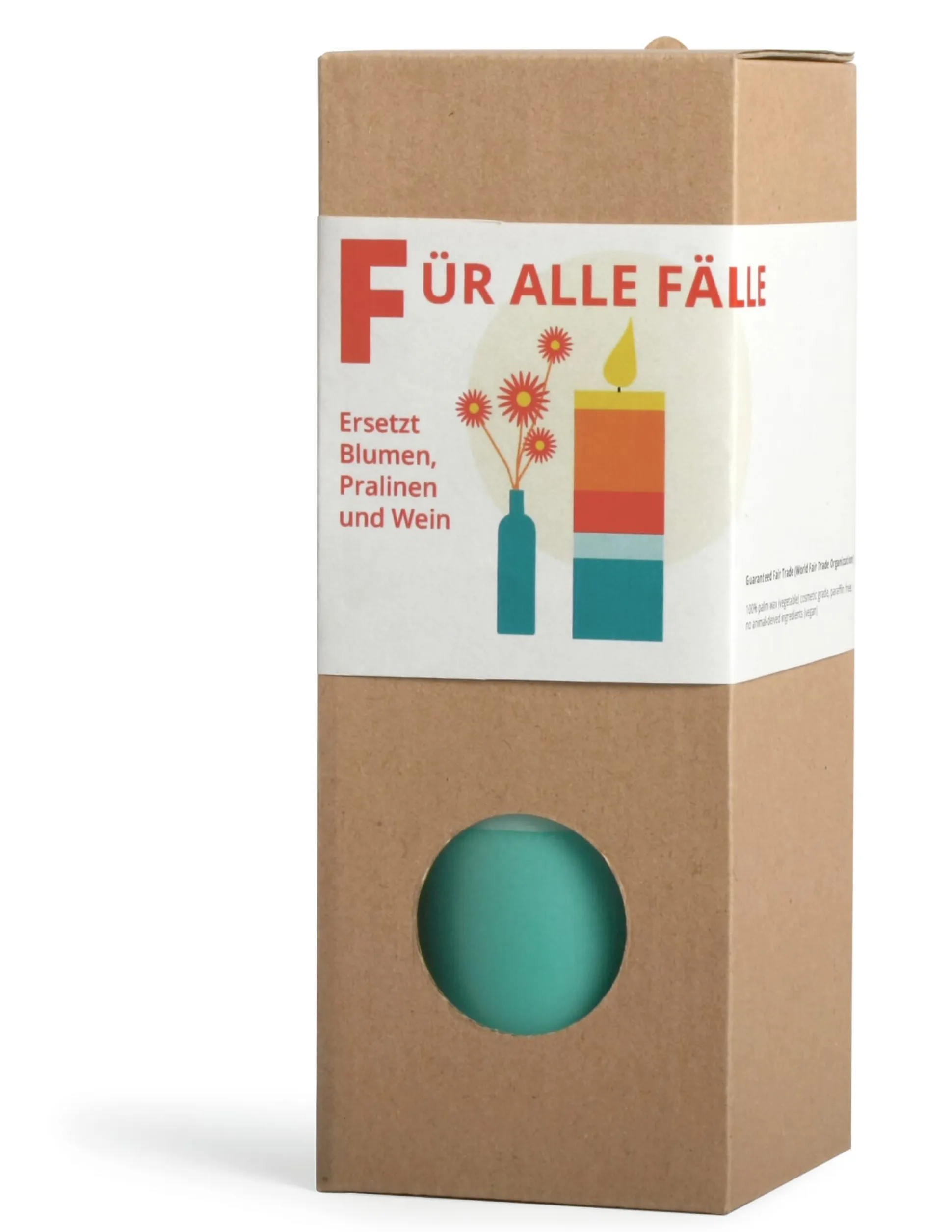 Als Geschenk, Glückwunsch oder kleines Mitbringsel zum Kaffee bei Freund*innen: Bei dieser zylindrischen Stumpenkerze aus durchgefärbtem, nicht tropfendem Wachs wird Farbschicht für Farbschicht per Hand gegossen. Aus fairem Handel, paraffinfrei, 73 Stunden Brenndauer.