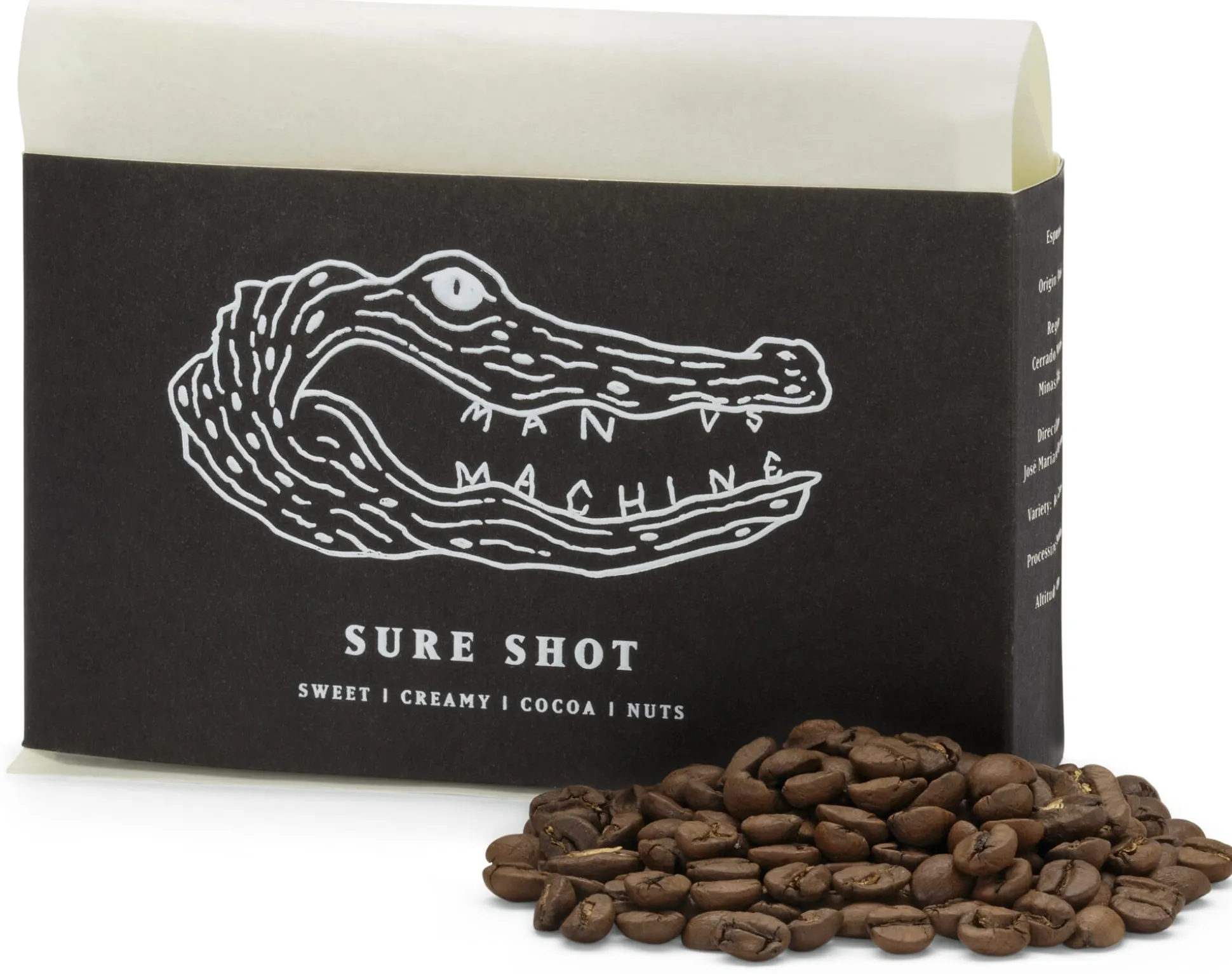 Die Bohnen für den Sure Shot stammen aus der Region Cerrado Mineiro im Südosten Brasiliens. Cerrado Mineiro liefert einige der besten Kaffees des Landes. Das liegt nicht zuletzt an den mineralreichen Böden und der Klimagunst: Die Temperaturen sind das ganze Jahr über relativ hoch, während die Niederschlagsmenge von November bis März am höchsten ist. Man versus Machine verwendet für den Sure Shot Kaffeebohnen der Sorte Red Catuai von der Farm von José Maria de Oliveira. Der Sure Shot zeichnet sich durch einen vollmundigen Geschmack, eine ausgewogene Säure und ein intensives Aroma aus. Dabei präsentiert er süße und cremige sowie schokoladige und nussige Geschmacksnoten.