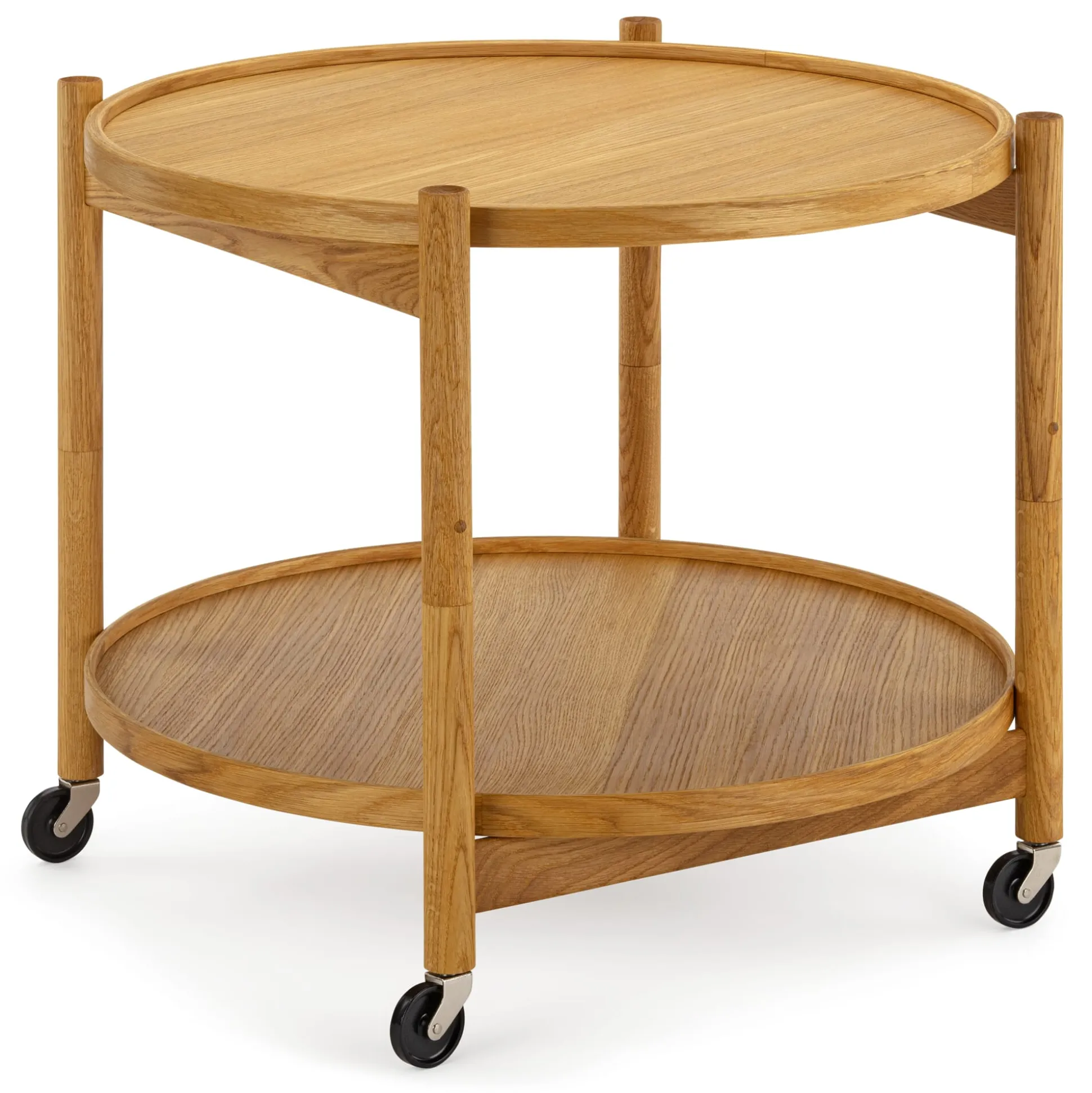Witz und Nutzen beweist dieser 1963 vom dänischen Architekten Hans Bølling entworfene Tablett-Tisch im Ganzen wie in seinen Einzelteilen. Seine kluge Konstruktion erlaubt es, die beiden Tabletts zu entnehmen und als solche zu verwenden. Der Wagen lässt sich leicht zusammenklappen – in den Tischbeinen verbergen sich Scharniere – und flach verstauen. Auf den leichtgängigen Rollen lässt sich der Tisch auch beladen bequem überall dorthin fahren, wo gerade eine kleine Abstellfläche benötigt wird. So kann das multifunktionale Möbel mal als Beistelltisch, mal als Servierwagen dienen und bei Nichtgebrauch platzsparend beiseitegestellt werden.