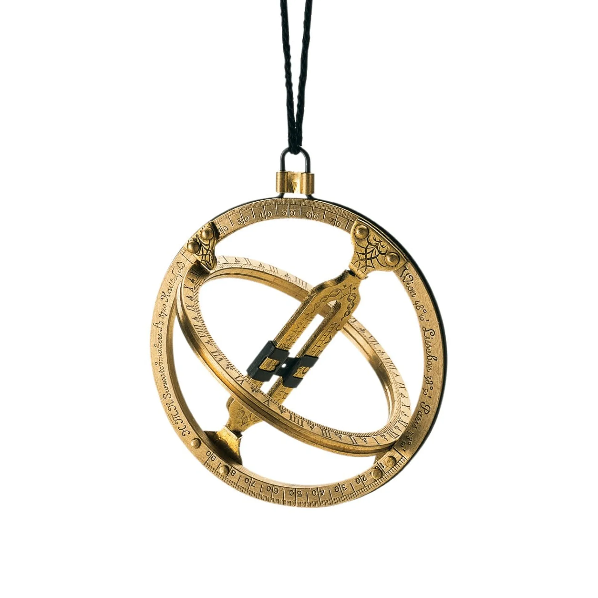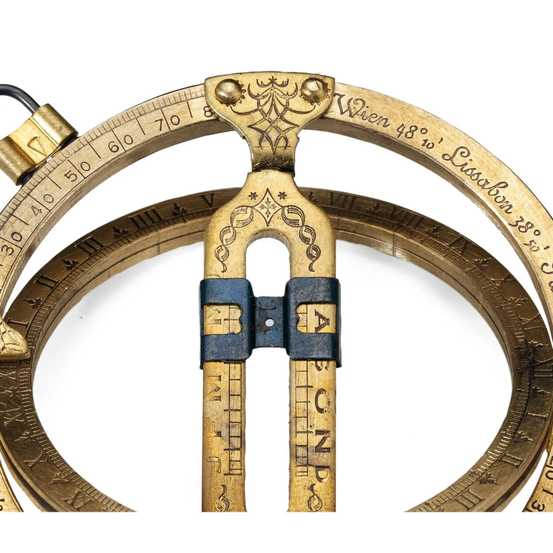 Bestehend aus einklappbarem Außenring, Innenring und Brücke. Messing und Stahl.