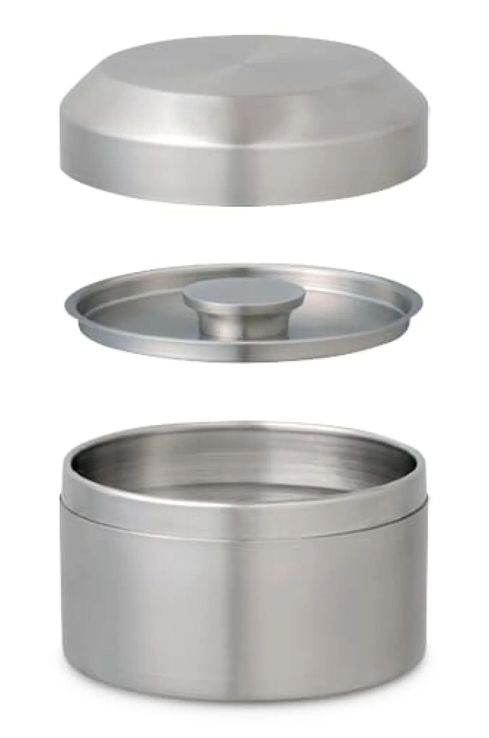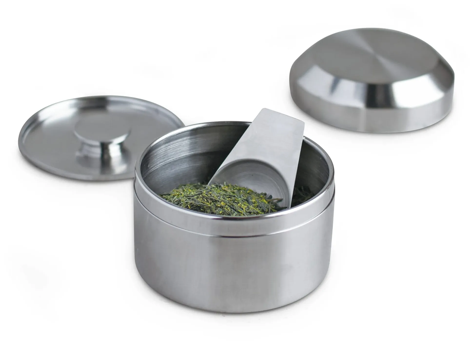 Für den feinen Lieblingstee: Neuinterpretation der dreiteiligen japanischen Zinn-Teedose. Aus Edelstahl, mit einem inneren, hochpräzise und dicht schließenden Deckel und einem äußeren Stülpdeckel. Die nahtlose, feine Verarbeitung lässt alle Teile passgenau ineinander fassen, sodass eine nahezu luftdichte Aufbewahrung des Tees ohne zusätzliche Dichtung ermöglicht wird.