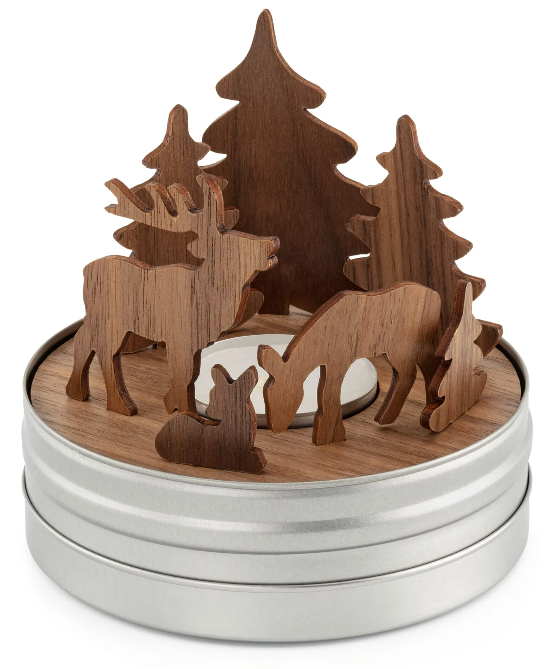 Teelichthalter Schachtelgeschichte Wald: Steckteile, Figuren aus Nussbaumholz und Teelicht in einer Metalldose.