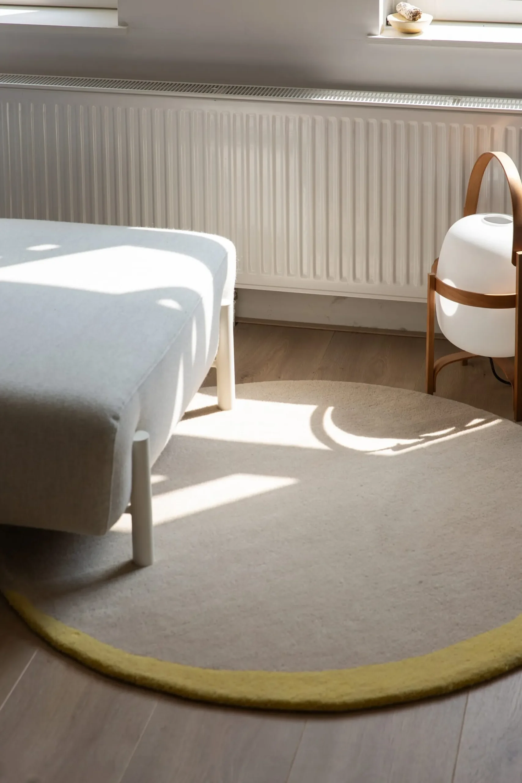 Runder Teppich in zwei Tönen aus Wolle getuftet: Die Grundfläche ist einfarbig, während der zweite Ton nur als feiner, punktuell gesetzter Rand erscheint – ähnlich dem hellen Lichtsaum bei einer Sonnenfinsternis. Das des Teppichs betont seine geometrische Perfektion und grafische Klarheit. Wie eine seltene Eclipse am Himmel wird der Teppich zum Hingucker auf dem Boden.