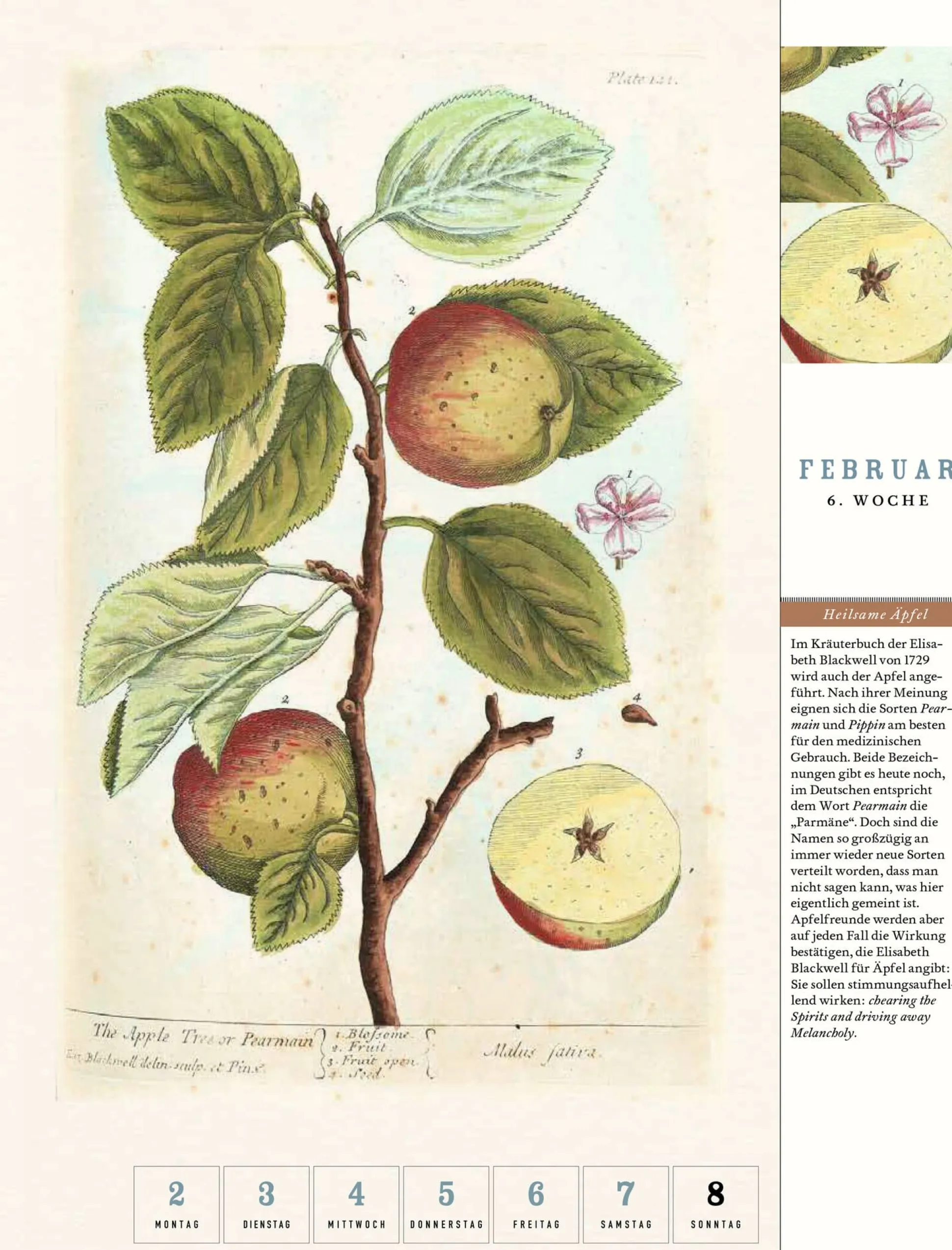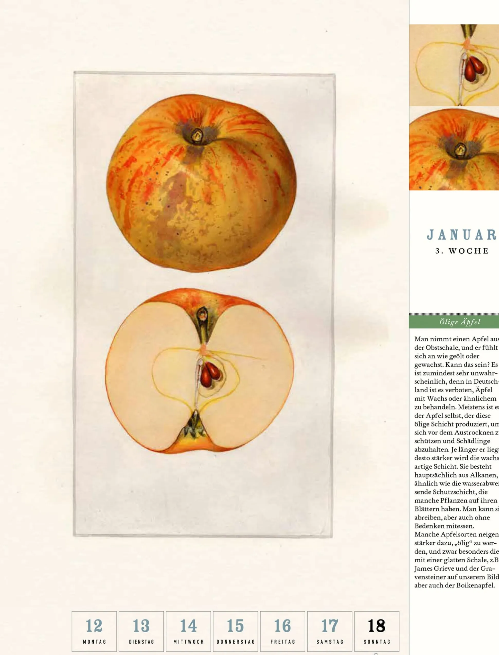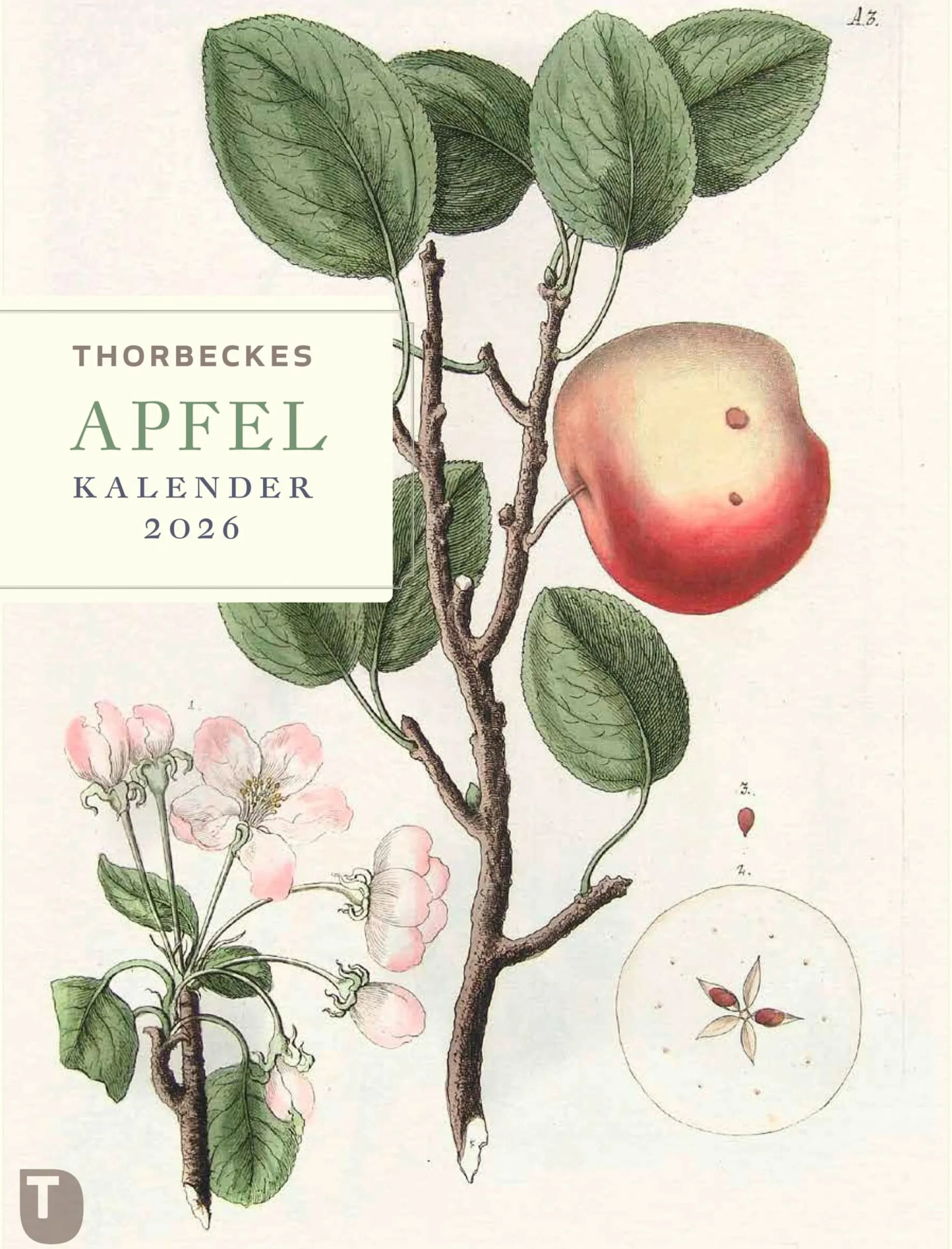 Erstaunlich ist’s, ein Apfel zu sein. Oder hätten Sie gewusst, dass zur Bestimmung einer Apfelsorte selbst Position und Größe des Kerngehäuses sowie die Anordnung der Kerne untereinander herangezogen werden? Sehen Sie, wir auch nicht. Wie faszinierend das doch aber erscheint! Es ist eben beileibe nicht jeder Apfel gleich, und auch nicht sein Kerngehäuse. So sehr wurde die Frucht des Apfelbaumes in den vergangenen Jahrhunderten züchterisch bearbeitet, dass sich kaum noch ein Stammbaum abbilden lässt. Pomolog*innen sprechen vielmehr von einem Cluster oder Netz, da Apfelsorten, die als „Eltern“ einer neuen Sorte gelten, in späteren Generationen wieder mit den jeweiligen Nachkommen dieses neuen Apfels gekreuzt werden können. Diese und viele weitere spannende und erhellende Fakten aus der wundersamen Welt der Äpfel vermittelt uns der Apfel-Kalender 2026 aus dem Verlag Jan Thorbecke und bedient sich dabei reizvoller historischer Abbildungen aus allerlei Sammlungen und Bibliotheksbänden. Die älteste Illustration ist dem „Kreutterbuch“ von Mattioli aus dem Jahr 1586 entnommen – so naturgetreu wie der tägliche Apfel in Ihrer Obstschale.