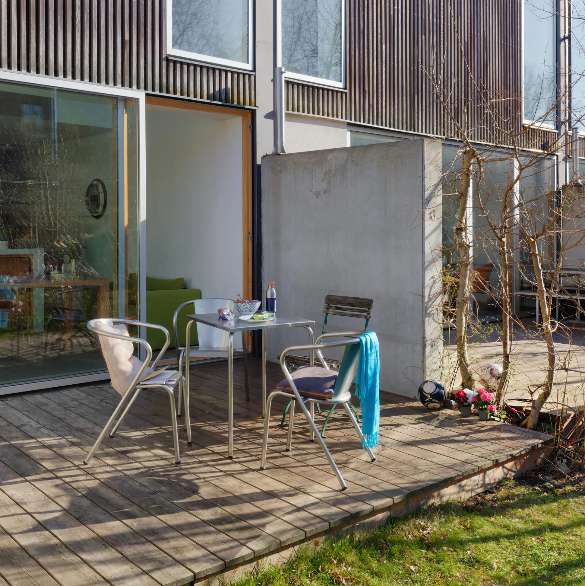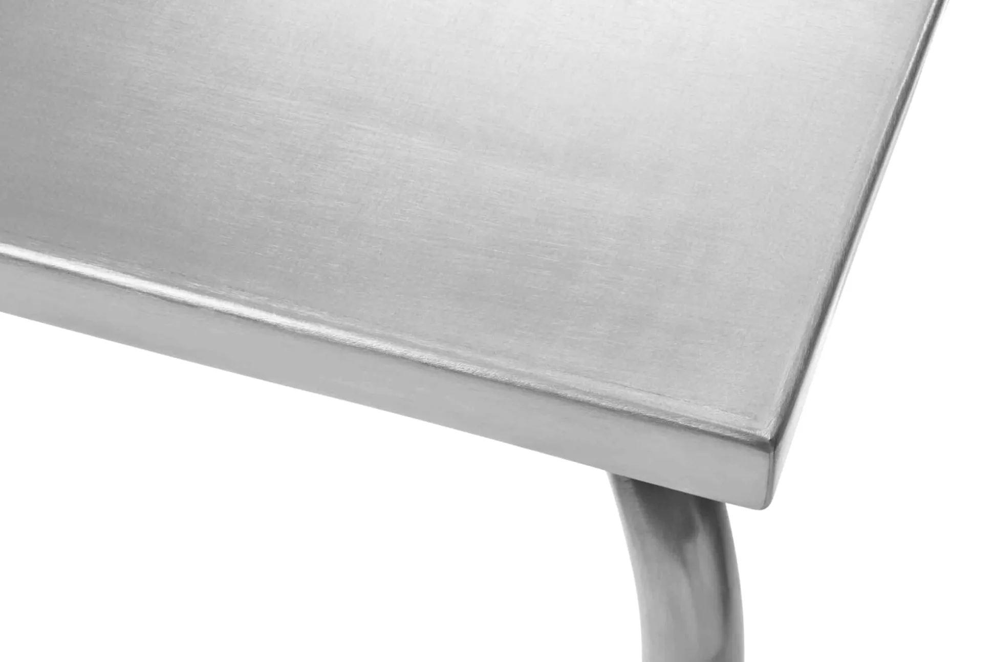 Der kleine Café-Tisch zum Stuhl ESTORIL – hier in Edelstahl in der Güte 316, einer dank des Molybdän-Anteils besonders widerstandsfähigen und pflegeleichten Version. Auch für die Nutzung in größerer Anzahl gut geeignet: kleine Fläche, stabiler Stand und stapelbar im Versatz.