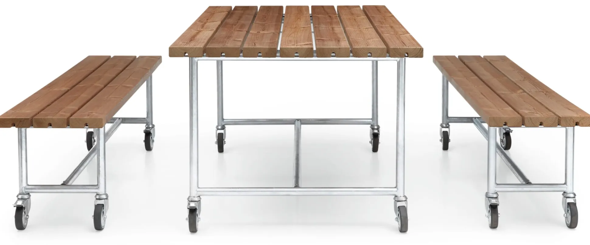 Von oben bis unten robust und nahezu unverwüstlich: Außenmöbel-Serie JÜTLAND zeigt mit ihrer industriellen Bauweise auf den ersten Blick, was sie kann. Feuerverzinkte Stahlgestelle und die Beplankung aus zertifizierter Thermokiefer aus Finnland trotzen der Witterung. Die Produkte sind auf ihren teilweise arretierbaren Schwerlastrollen leicht in Hof und Garten zu bewegen.
