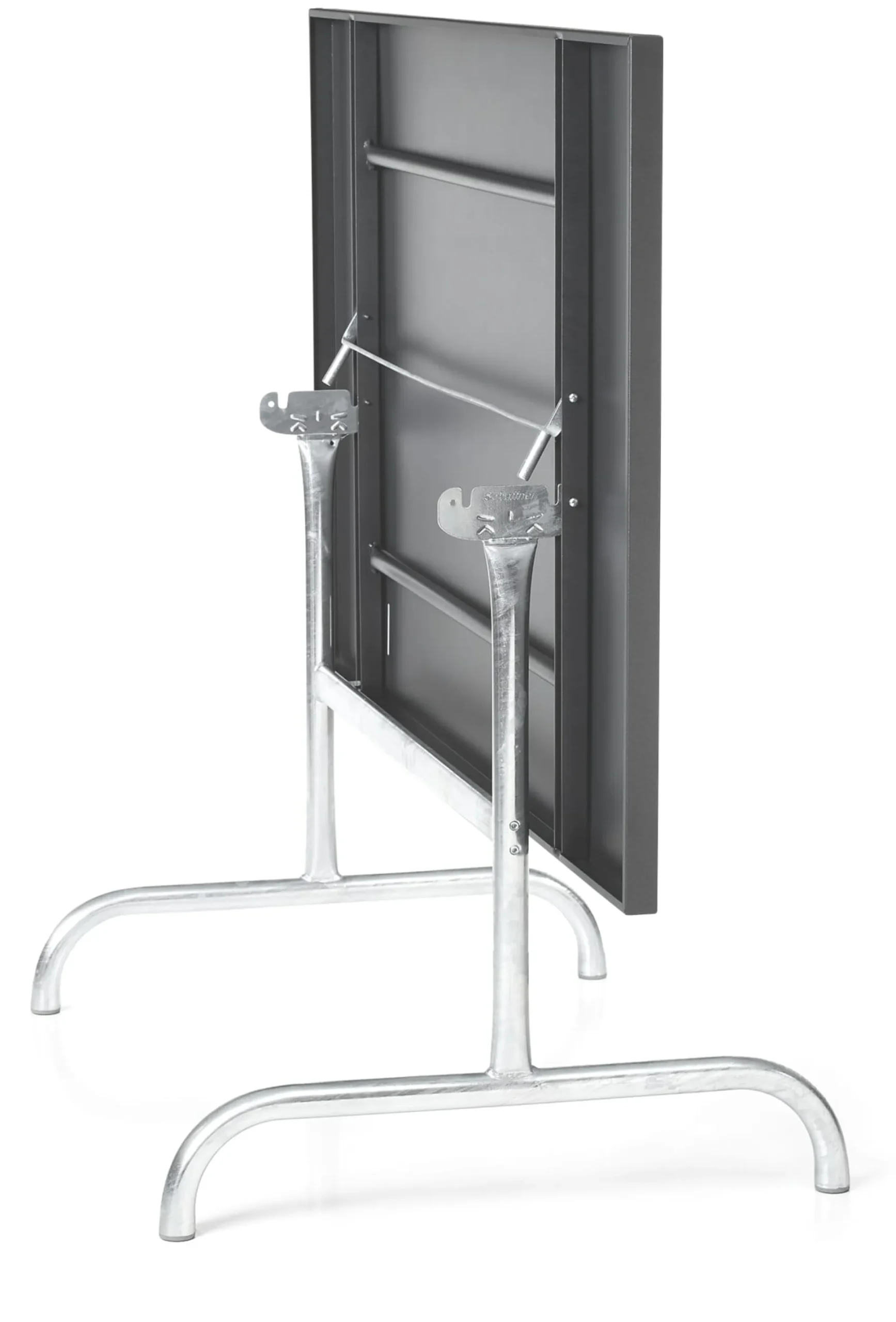 Robuster rechteckiger Tisch für den Außenbereich. Der mit einem feuerverzinkten Gestell ausgestattete Tisch stammt aus einem Schweizer Familienbetrieb, der sich in 3. Generation auf die Fertigung von hochwertigen Möbeln für die Außenmöblierung spezialisiert hat. Die Platte ist abklappbar, besitzt eine Schutzarretierung und ist bei Bedarf zur platzsparenden Unterbringung mit einem Handgriff abnehmbar. Höhenverstellbare Stellfüße aus Kunststoff schützen empfindliche Untergründe. Der Tisch kommt demontiert und lässt sich mit geringem Aufwand montieren.