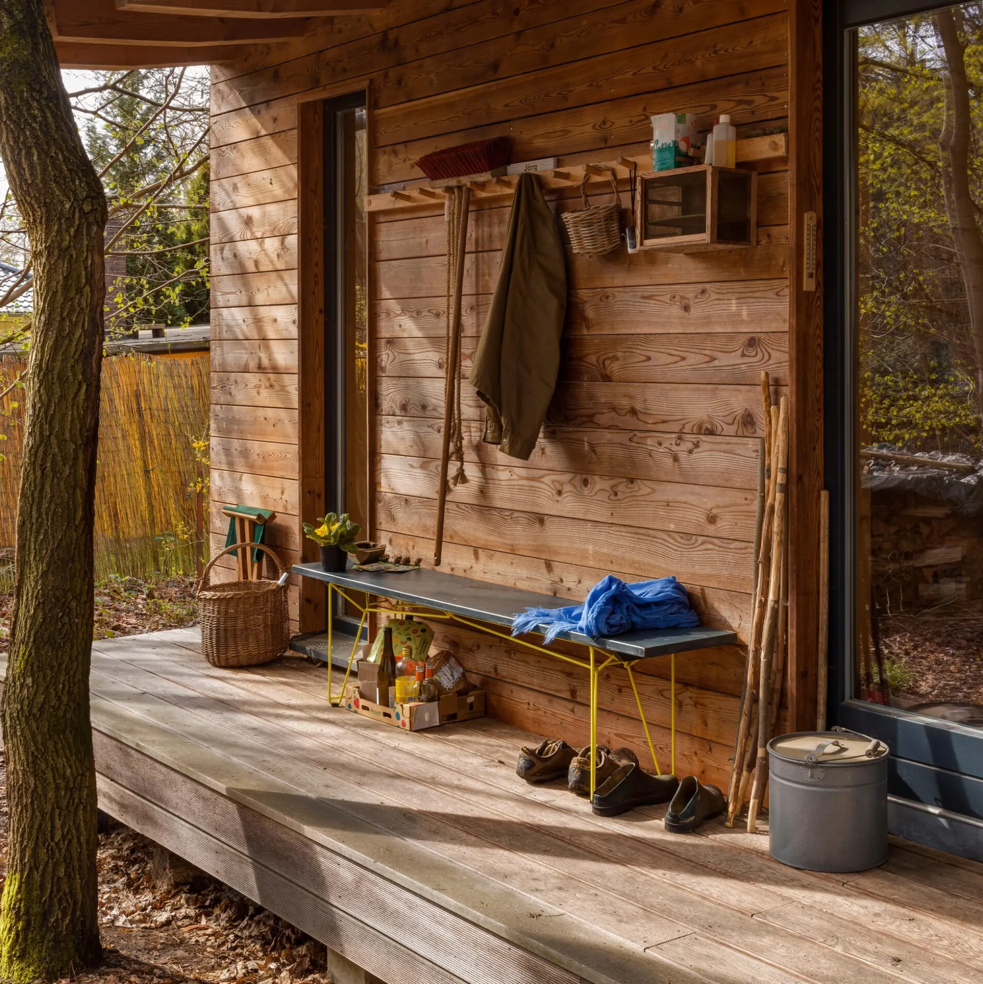 Bei dem verwendeten Material fiel unsere Wahl auf eine aus Douglasie und Lärche bestehende dreischichtige Platte, die in ihrer Ausführung mit der sichtbaren Schichtung und ihrer Charakteristik dem Entwurf entspricht. Dieses Plattenmaterial wird als robustes und dauerhaftes Bau- und Konstruktionsholz verwendet, hat eine dementsprechende Ausführung in Oberfläche und Kantenausbildung und weist Unebenheiten und Rauheiten auf. Es ist in seiner Beschaffenheit nicht mit einem Möbelbauholz für den Innenbereich zu vergleichen, besitzt aber gerade dadurch einen passenden Charakter.