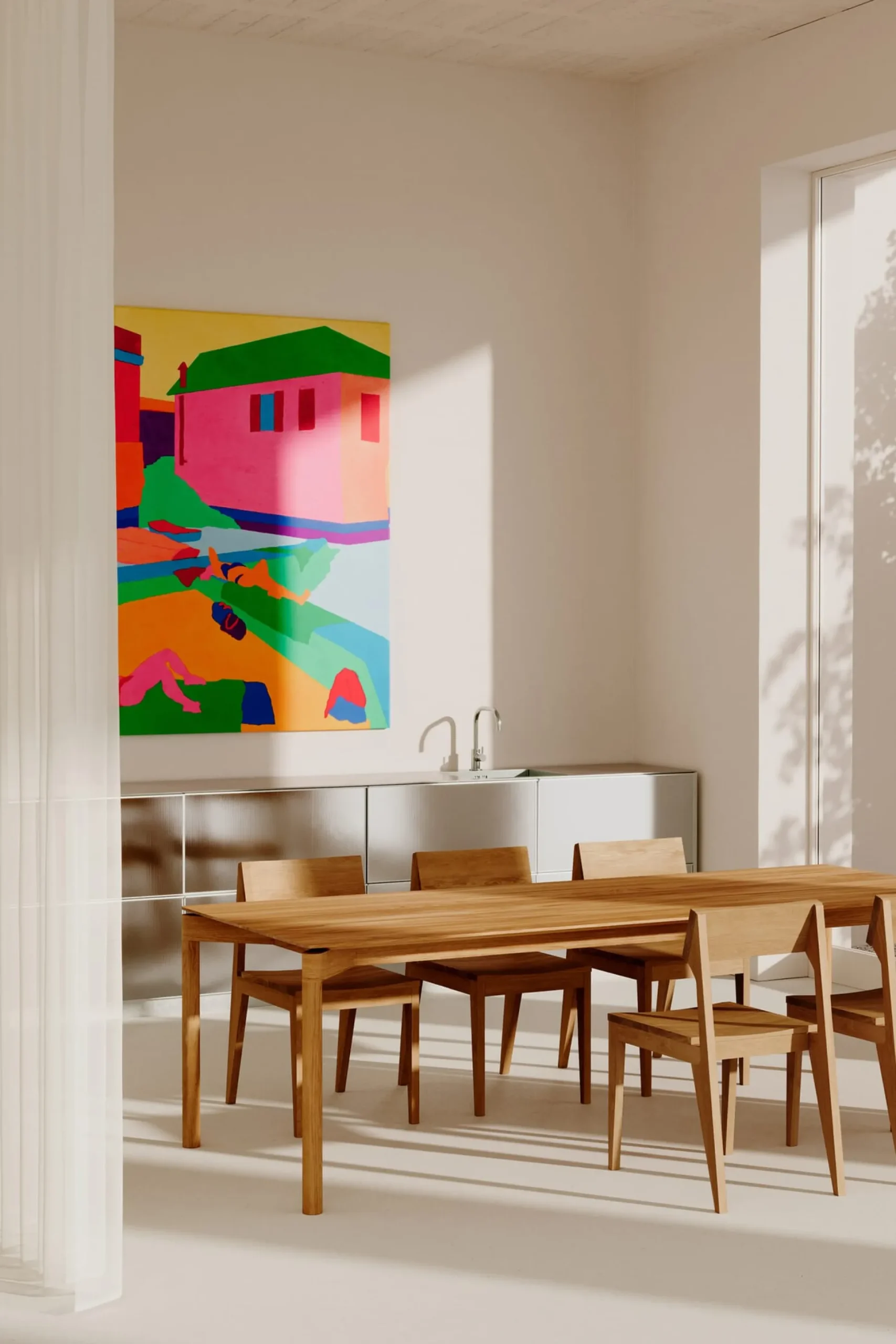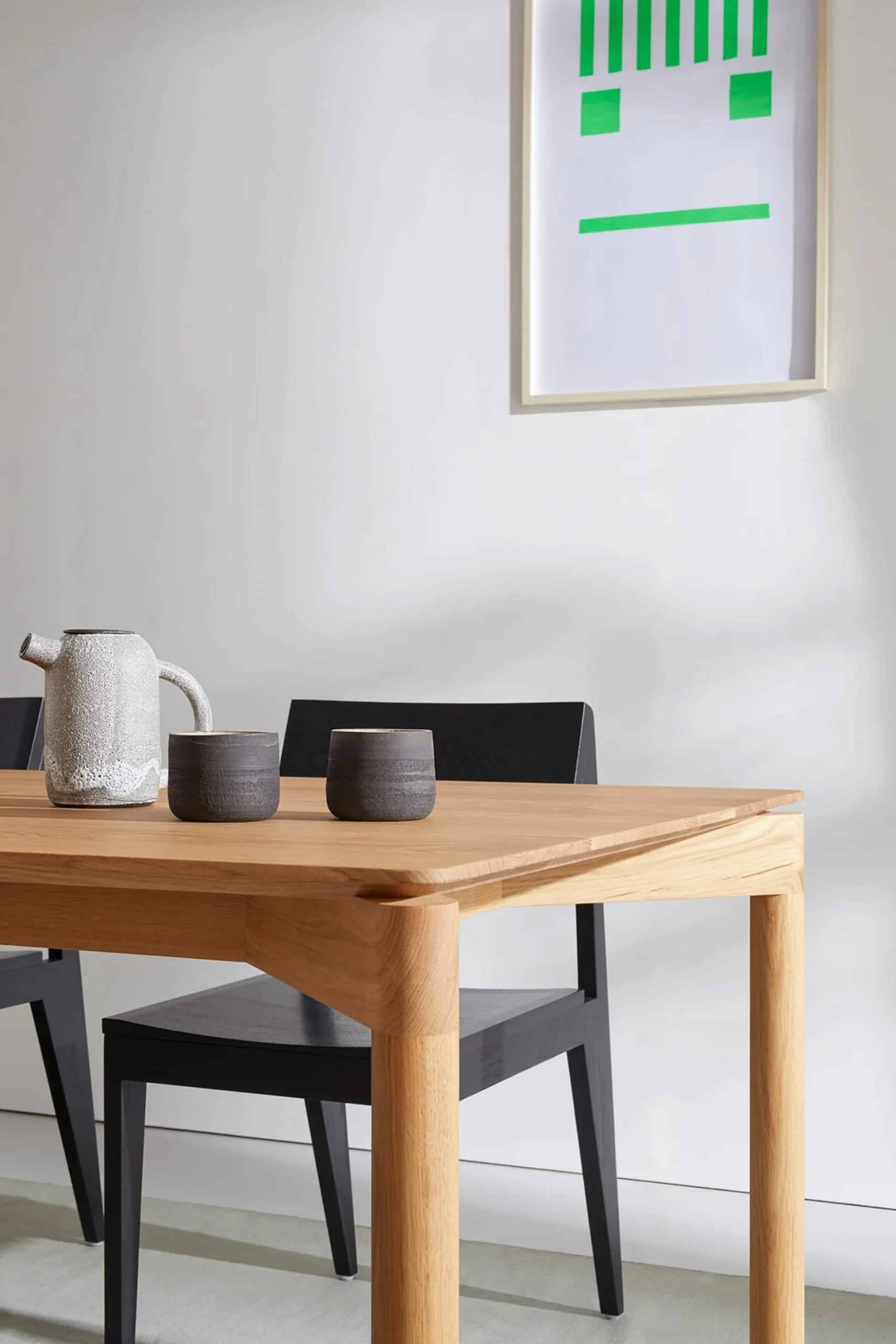 Bei diesem Tisch ist die Zarge der wahre Hauptdarsteller. Beindruckend sind die handwerkliche Präzision, mit der sie gefertigt ist, die kraftvolle Ästhetik, mit der sie den Tisch formal prägt, und die Länge der Strecke, die sie ohne weitere Stützen überbrückt. Die filigrane Tischplatte erscheint vergleichsweise leicht und über der Zarge schwebend. Die kreisrunden Beine sind zurückhaltend, wohlproportioniert und stabil zugleich. Ein echtes Stück Handwerkskunst, in Deutschland aus massiver Eiche gefertigt, und ein Bekenntnis zu bewusstem Konsum und langjährigem Gebrauch. Ideal als Arbeits-, Konferenz- oder Esstisch. Ein Tisch, der lange bleibt.
