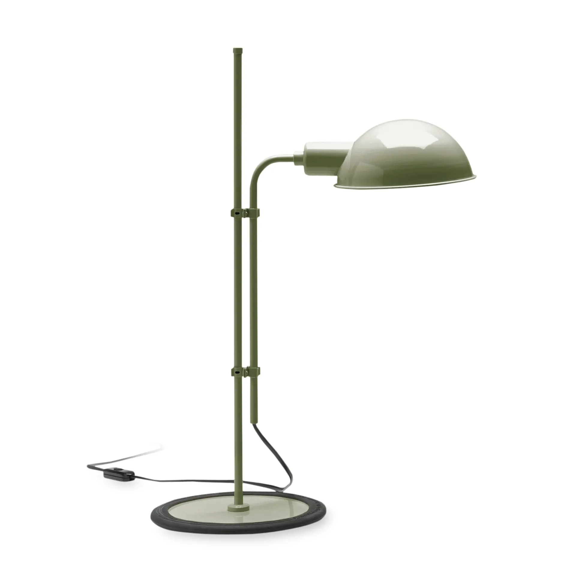 Schafft mit ihrem Reflektor in Form eines Kugelausschnitts schöne Lichtinseln: Die Leuchte FUNICULI besticht in ihrer Einfachheit und ihrem Effekt. Die beiden parallel laufenden Stäbe des Stativs lassen sich gegeneinander verstellen und regulieren so die Höhe der Leuchten. Der um die Standardfassung platzierte, halbkugelförmige Schirm ist um 360 Grad dreh- und somit nach allen Seiten orientierbar. Zum Schutz der Oberflächen am Standort trägt die Fußplatte einen breiten Gummiring.
