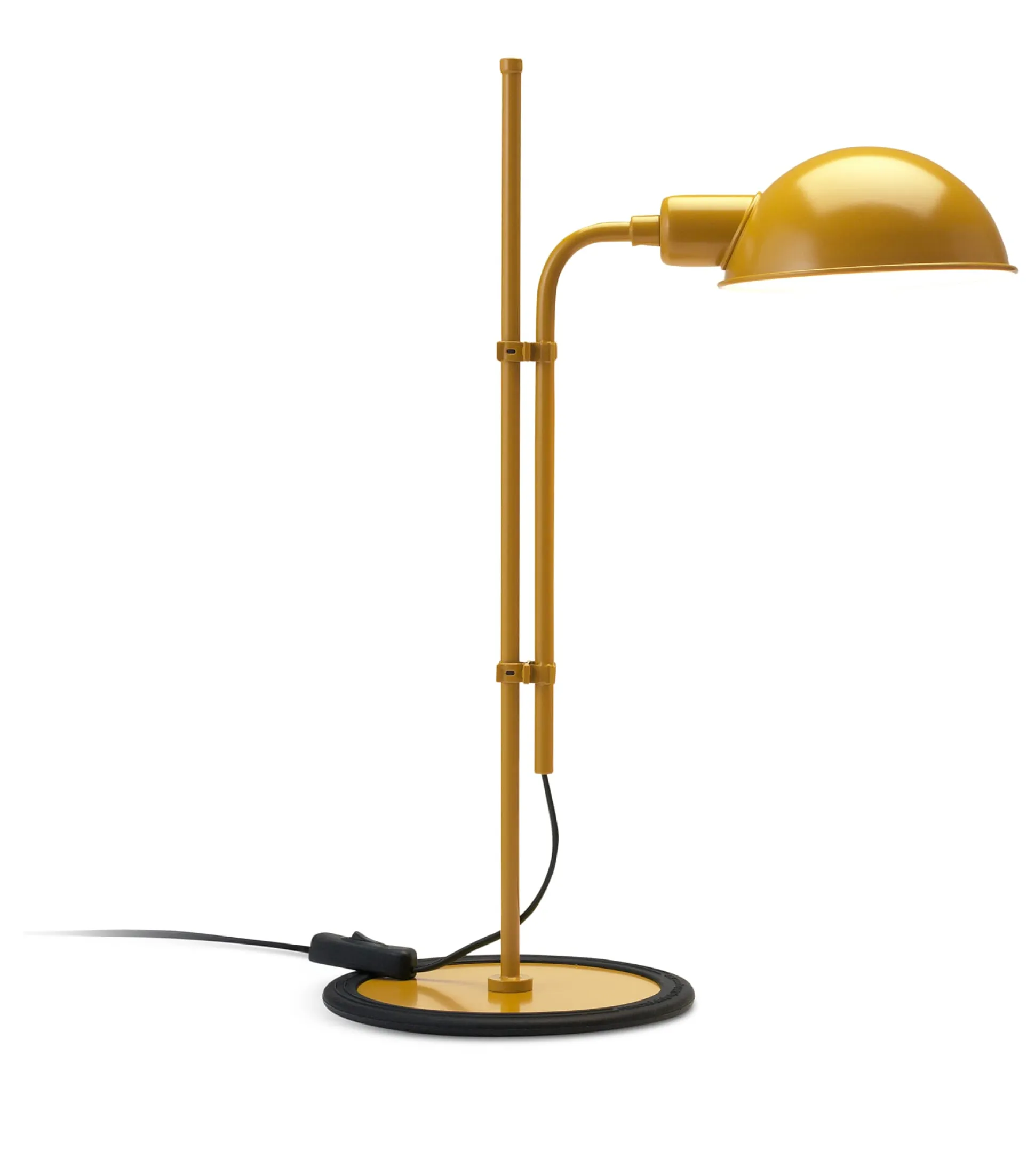 Schafft mit ihrem Reflektor in Form eines Kugelausschnitts schöne Lichtinseln: Die Leuchte FUNICULI besticht in ihrer Einfachheit und ihrem Effekt. Die beiden parallel laufenden Stäbe des Stativs lassen sich gegeneinander verstellen und regulieren so die Höhe der Leuchten. Der um die Standardfassung platzierte, halbkugelförmige Schirm ist um 360 Grad dreh- und somit nach allen Seiten orientierbar. Zum Schutz der Oberflächen am Standort trägt die Fußplatte einen breiten Gummiring.