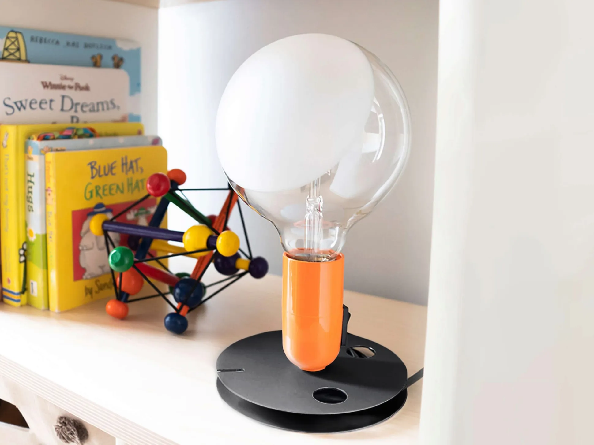 Achille Castiglioni ist Altmeister des italienischen Designs. Zusammen mit seinen Brüdern Livio und Pier Giacomo gründete er 1944 in Mailand ein Architekturbüro und prägte mit seinen Entwürfen in Produktdesign und Architektur ein halbes Jahrhundert italienischer Formensprache. Was seine Entwürfe auszeichnet, ist sein humorvoller und spielerischer Umgang mit Gestaltung. Typisch ist die Nutzung von Elementen, die dem Betrachter aus anderen Kontexten geläufig sind. Beispielhaft für diese Art der Dekontextualisierung ist die Filmrolle, die den Sockel der Leuchte LAMPADINA bildet. Diese Filmrolle dient gleichzeitig als Spule für das Zuleitungskabel. Die Leuchte besitzt kaum mehr Bauteile und war ursprünglich als Geschenk für die Besucher des neuerrichteten Showrooms des Leuchtenherstellers FLOS in Mailand gedacht. Ergänzt um einen Lampensockel – ursprünglich mit einem Knebelschalter ausgestattet, nun mit einem Kippschalter – wird sie zur Zusatzleuchte an vielerlei Plätzen im Wohn- und Arbeitsraum. Dieser sympathische Entwurf steht archetypisch für die Arbeiten Castiglionis.