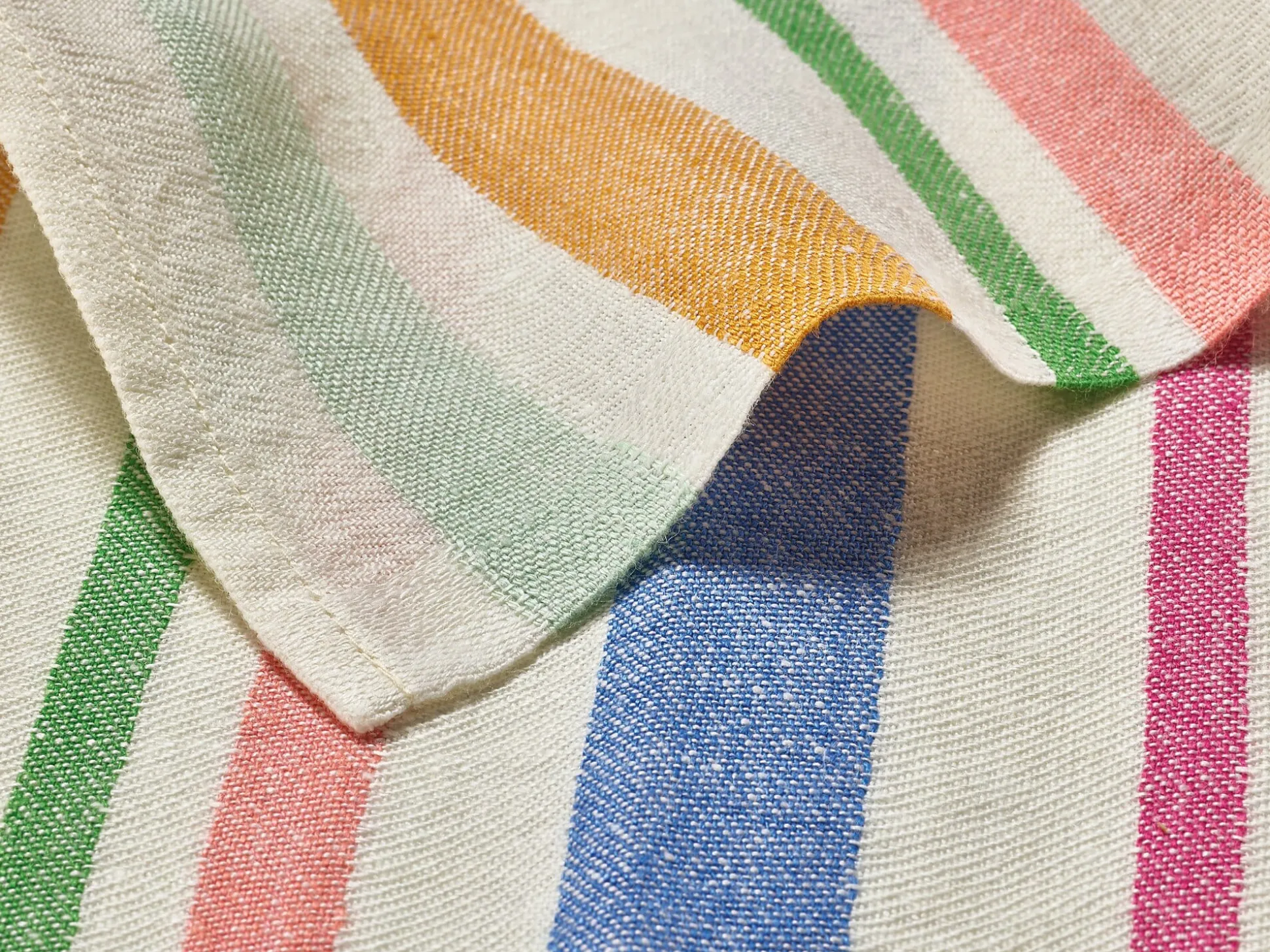 Ihr Design und die fröhlichen Farben verdankt das Tuch diesem kenianischen Einfluss, denn in den naturweißen Fond sind unterschiedlich breite, garngefärbte Streifen eingewebt. Das Leinengewebe wird nach dem Weben und Konfektionieren bereits vor Ort gewaschen, es erhält dadurch einen weichen Griff und eine lebendige Struktur – lässt sich daher aber auch nicht mehr perfekt glattbügeln. Nur beste Leinengarne aus Langfaserflachs europäischer Provenienz kommen auf die Webstühle des mittlerweile in der vierten Generation geführten Unternehmens. Die passende Tischdecke und ein Geschirrtuch sind ebenfalls erhältlich.