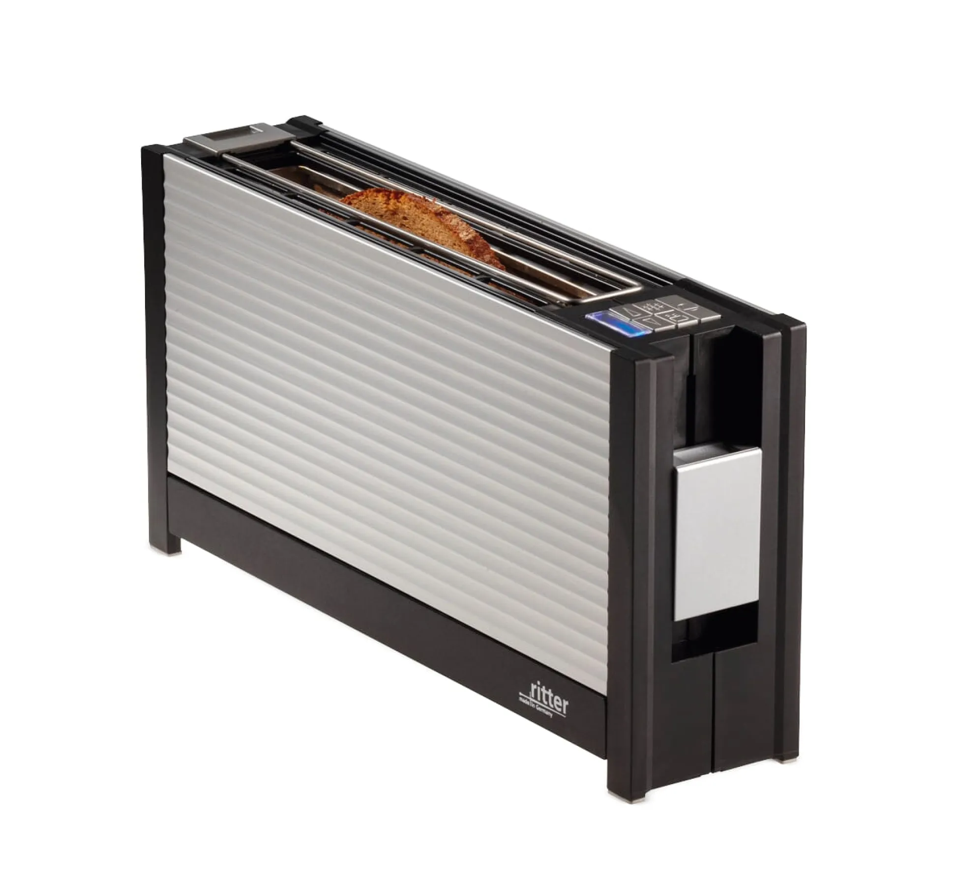 Schöne technische Form und 9 Zentimeter schlank – VOLCANO röstet zwei Scheiben gleichzeitig und verfügt über eine automatische Röstgutzentrierung, eine Auftau- und Aufwärmfunktion sowie eine integrierte, ausklappbare Brötchenauflage und das obligatorische Krümelfach. Der Röstgrad wird digital über LEDs angezeigt. Das wärmeisolierte Gehäuse, die automatische Abschaltung bei Klemmen des Toastes und eine separate Stopptaste zum Unterbrechen des Produktionsvorgangs gewährleisten sicheres Hantieren. Leistungsaufnahme: 900-950W. Kabellänge: L 105 cm, Schutzkontaktstecker (Typ F).