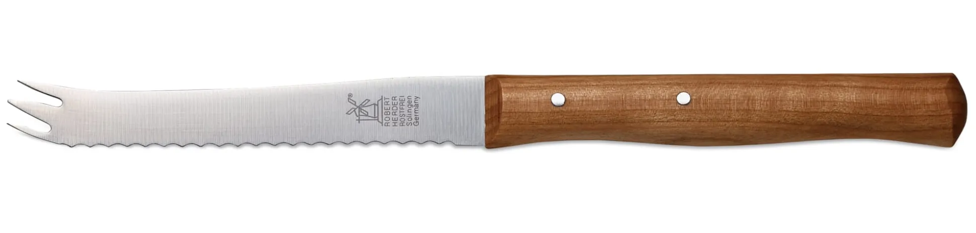 Ein Windmühlenmesser von Robert Herder in Solingen. Feingepließte Wellenschliffklinge mit Gabelspitze aus Chrom-Molybdän-Vanadium-Stahl, rostfrei. Griffe aus gedämpftem und poliertem Kirschholz.
