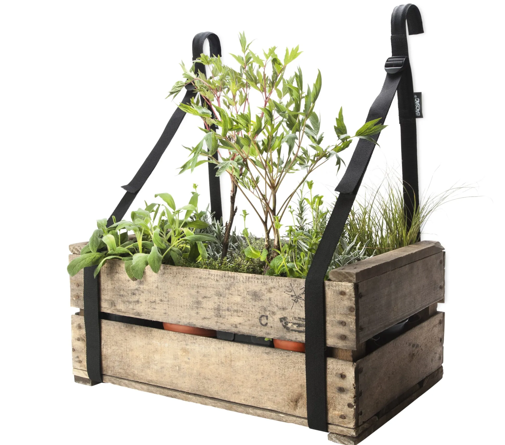 Erweitern Sie Ihren Balkon: Mithilfe dieser einhängbaren Gurte, lassen sich Kisten und Fachböden unterschiedlicher Formate an Balkongeländer oder ähnliche Vorrichtungen anhängen. Die hier gezeigte Weinkiste stellt dabei nur eine Möglichkeit der Nutzung dar. Auch Bretter, Bohlen oder andere Behälter sind dafür einsetzbar.