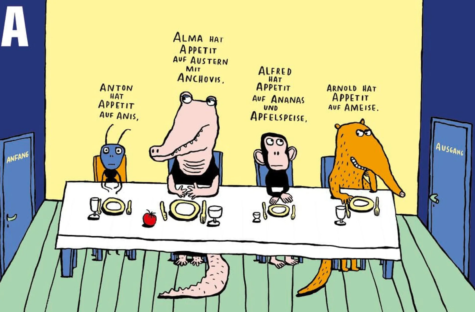 Hätten wir alle mit einem ABC-Buch wie diesem unsere Schullaufbahn beginnen dürfen: Wir wären andere geworden! Hier bleibt kein Zweifel, dass man mit Buchstaben viel mehr anstellen kann, als mühsam das Buchstabieren einsamer kleiner Wörter zu üben. Von Anfang an geht es mit einem Feuerwerk von tollen Einfällen ans Werk. Wurde uns damals zum Buchstaben P allenfalls ein „Pilz“ in Wort und Bild serviert, so finden wir hier, begleitet von hinreißend komischen Illustrationen, dies: